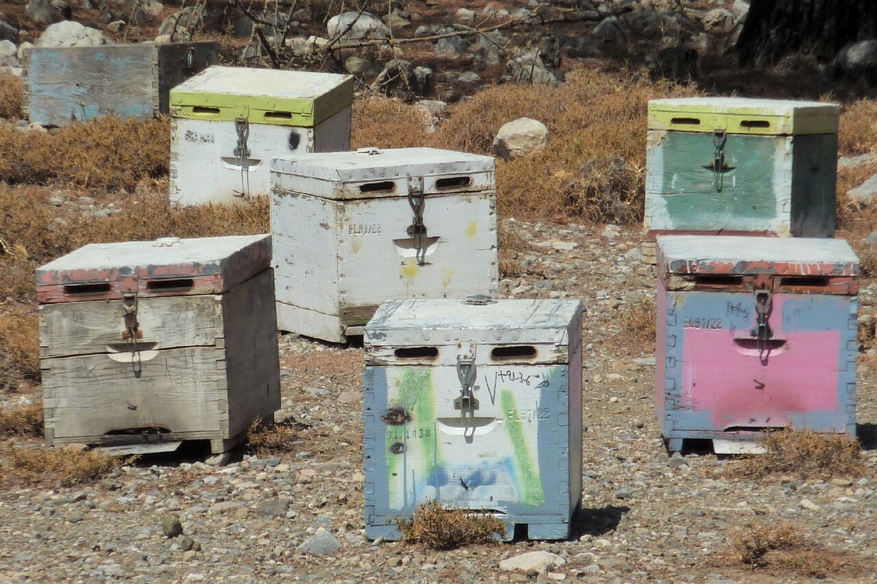 Auf der nächsten Hochfläche, hier befindet sich ein kurzes betoniertes Stück, lassen wir den rechten Abzweiger liegen, gehen geradeaus und erreichen eine weitere 02 Hochebene (724 m). Wir gehen weitere 4,4 km, überschreiten einen Scheitelpunkt und gehen bei der folgenden Weggabelung rechts. Bei einer Riesenkreuzung mit einer Sitzgelegenheit halten wir uns links und gehen weiter bergauf. In der nachfolgenden Region haben die Bienen ihr kleines Reich. Imker aus ganz Kreta bringen im Frühjahr ihre Bienenstöcke in die Wälder bei Selekano, es ist die größte Bienenzucht der Region.