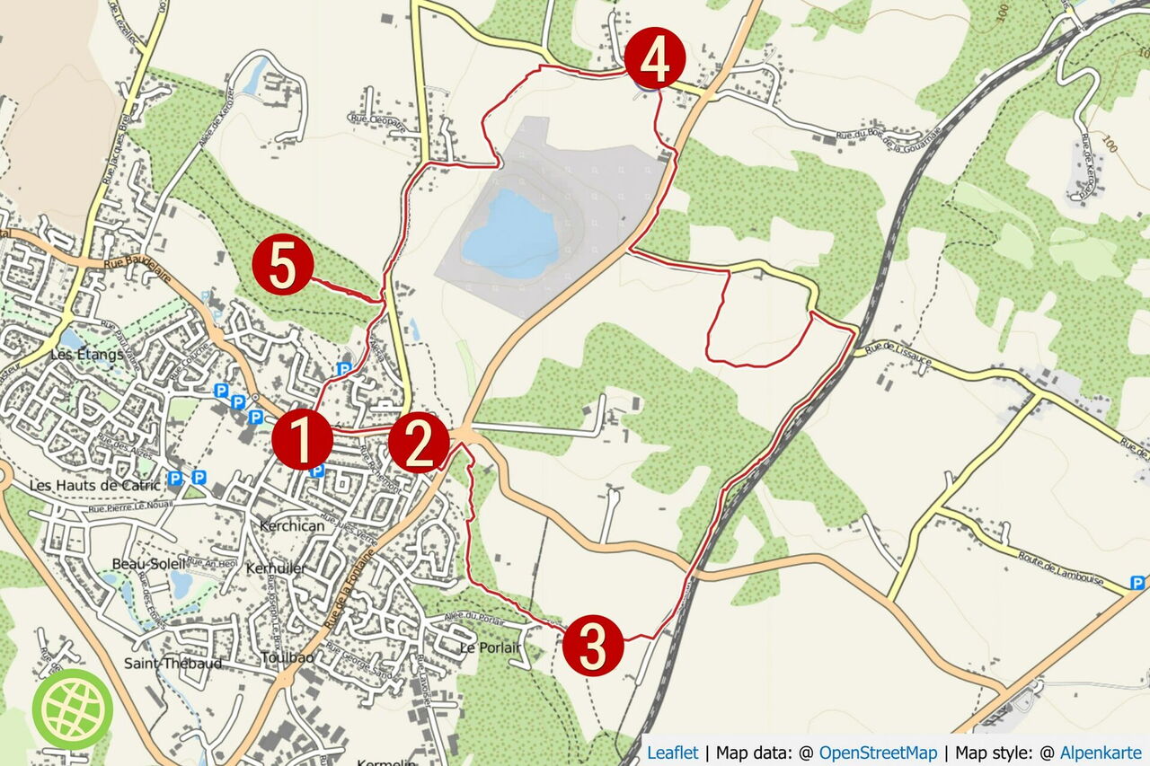 Der Pfad mündet in die Rue de Fontenon, auf der wir 270 m gehen, um bei einem weiteren Markierungspfeiler aus Holz die Straße nach halb links zu verlassen. Durch ein Waldgebiet gehen wir entlang des Baches Lihuanteu und erreichen kurz hinter einer Straße einen Steinbruch mit See. Am Ende der Straße gehen wir links leicht bergab, bis wir bei dem Ortseingangsschild von Saint-Avé rechts über den Zebrastreifen gehen und auf einen Fußgängerweg parallel zur Straße gelangen. Bei einem Felsen, der auf dem Weg liegt, gehen wir rechts den Pfad hoch, dann auf dem nachfolgenden Weg links, sofort rechts über die Holzbohlen und nun immer geradeaus durch den Wald von Belvédère bis zum 05 Belvédère de Kerozer (63 m). Dort befindet sich eine alte Windmühle, die zum Gut Kerozer gehört. Wir gehen auf dem gleichen Weg bis zu den Holzbohlen zurück, dort rechts und bei der darauffolgenden Straße abermals rechts. Wir verbleiben nun immer auf der Rue d'Alésia und der Rue du Lavoir, bis die Kirchenspitze den verbleibenden Weg weist.