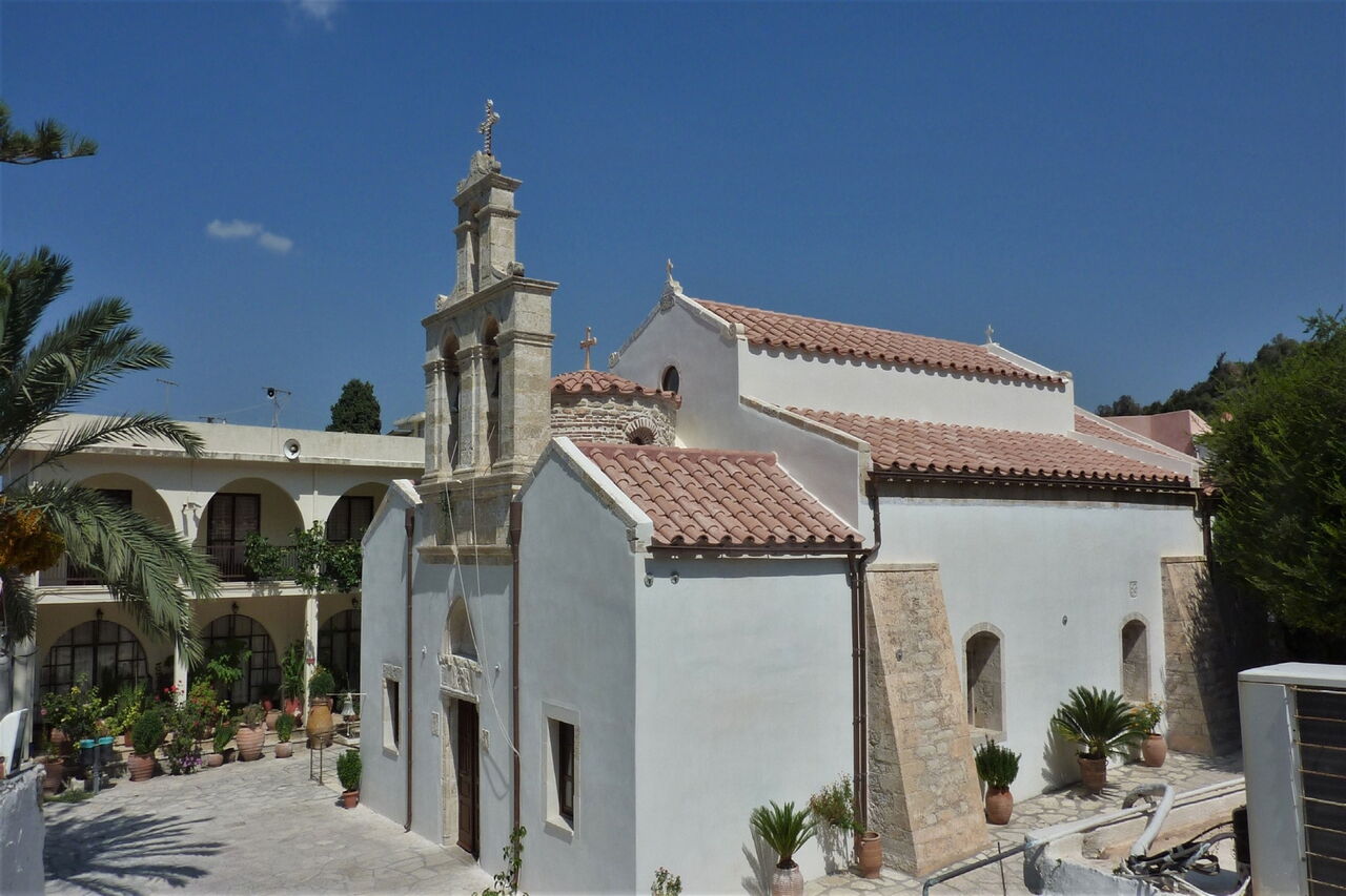 Nach 300 m, vor einem runden Wassertank, kürzen wir abermals über die Piste nach rechts ab. Weitere 280 m gehen wir durch die Talsohle und biegen bei der großen Kiefer links ab, gehen sofort wieder rechts und nun für 800 m leicht bergauf, bis unsere Piste in eine weitere mündet. Kurz später mündet von links eine Piste in unserer Hauptpiste. Wir kommen an einer kleinen Kirche vorbei und erreichen den Parkplatz des 03 Paliani Convent (339 m), das älteste Nonnenkloster auf Kreta. Nach der Besichtigung gehen wir auf der Hauptstraße weiter und sehen im Tal rechts die Ruinen des Tempels Oktarsissa. Ein lohnenswerter Abstecher. Es geht nun weiter bergab bis auf die Höhe einer riesigen Platane – in 50 m Entfernung befindet sich ein Brunnen. Hier gehen wir links hoch und bis zur Hauptstraße vor, um dort 300 m rechts bis zur Kreuzung vorzugehen.