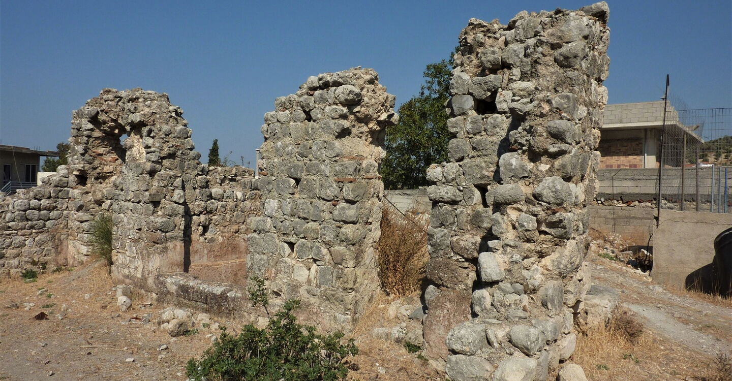 An dieser 02 Schlüsselstelle (136 m) gehen wir links am Reservoir und Schilfgras vorbei, dann im Bachbett 10 m rechts, um an geeigneter Stelle den Bach auf die andere Uferseite zu verlassen. Zwischen den Weinstöcken führt ein Wirtschaftsweg bergauf, den wir begehen, bis dieser endet und wir rechts an einem weiteren Wasserreservoir vorbeikommen. Wir ignorieren 3 rechte Abzweiger und gehen durch eine Links- und eine Rechtskehre, nun direkt auf die Kirche des Dorfes Kiparissos zu. Auf der Asphaltstraße verlassen wir das Dorf in Richtung Westen und der Ortschaft Pirgos, wo wir bei den Ruinen rechts hinunter einen Abkürzer zur unterhalb liegenden Asphaltstraße nehmen.