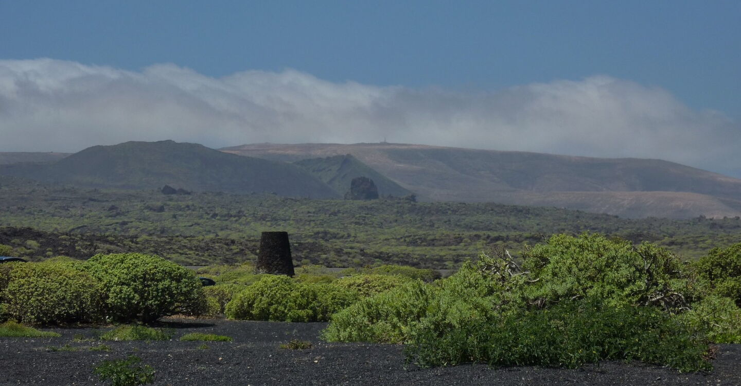20 m hinter dem rechts von uns liegenden Parkplatz zu den (04) Cueva de los Verdes (55 m) zweigt links eine Asphaltstraße ab - diese ist für Autos gesperrt. Nach 120 m macht die Asphaltstraße eine 90°-Linkskehre und führt zu einem Gebäude, an dem wir bereits in 50 m Entfernung vorbeigegangen sind. In dieser 90°-Kehre verlassen wir die Asphaltstraße, gehen nun auf einem kaum erkennbaren Pfad - eigentlich ist die Beschreibung weglos treffender -, in Verlängerung der Asphaltstraße, geradeaus in südöstlicher Richtung. Als weitere Orientierungspunkte findet man nun immer wieder kleine Betonsockel, aus denen abgeschnittene und verrostete Metallrohre herausstehen. Kurz später treffen wir auf einen breiteren Weg. Wir gehen nun parallel zur LZ-1. Nach 900 m befinden wir uns auf Höhe einer Ruine, die rechts oberhalb von uns steht.
