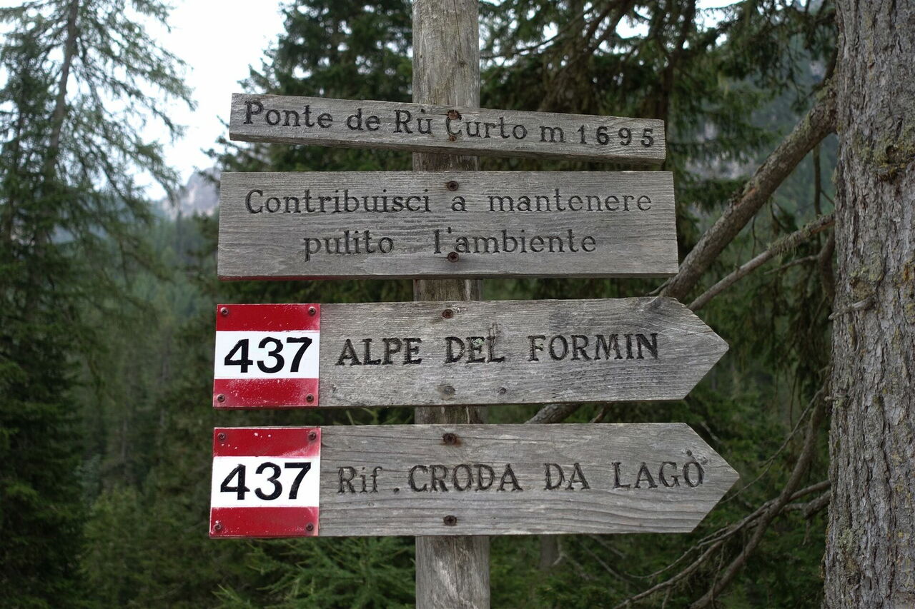 Der Aufstieg durch das Valle Formin, zu Füßen des Bergmassivs Croda da Lago, ist landschaftlich wunderschön. An der 1.845 m hoch gelegenen Weggabelung Cason de Formin gehen wir geradeaus. Ab hier hat der Wanderweg die Nummer 434. An der nach ca. 60 m folgenden 04 Weggablung (1.861 m) ignorieren wir den links abzweigenden Sentiero zur Cason de Formin und folgen dem durch eine Rechtskurve weiterführenden Pfad.