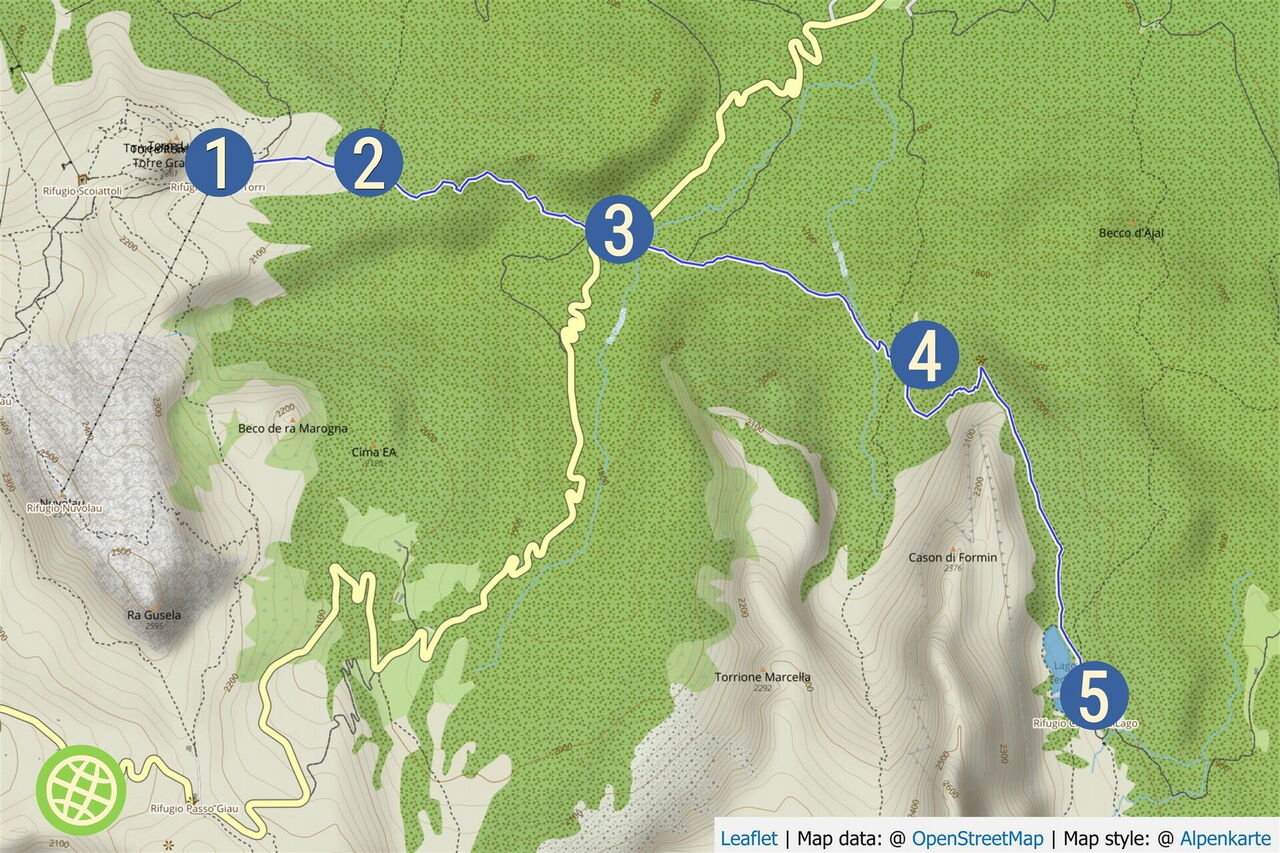Startpunkt: Das Rifugio Cinque Torri ist nur zu Fuß erreichbar und befindet sich am Ende der Tour 8. Einstieg/Abbruch: Am Wegpunkt 03 befindet sich die Bushaltestelle Pian del Pantan. Von dort kann man mit dem Bus zur Passo-Giau-Straße hochfahren oder nach Cortina herunterfahren. Endpunkt: Das Rifugio Croda da Lago ist nur zu Fuß erreichbar und befindet sich am Anfang der Tour 10.