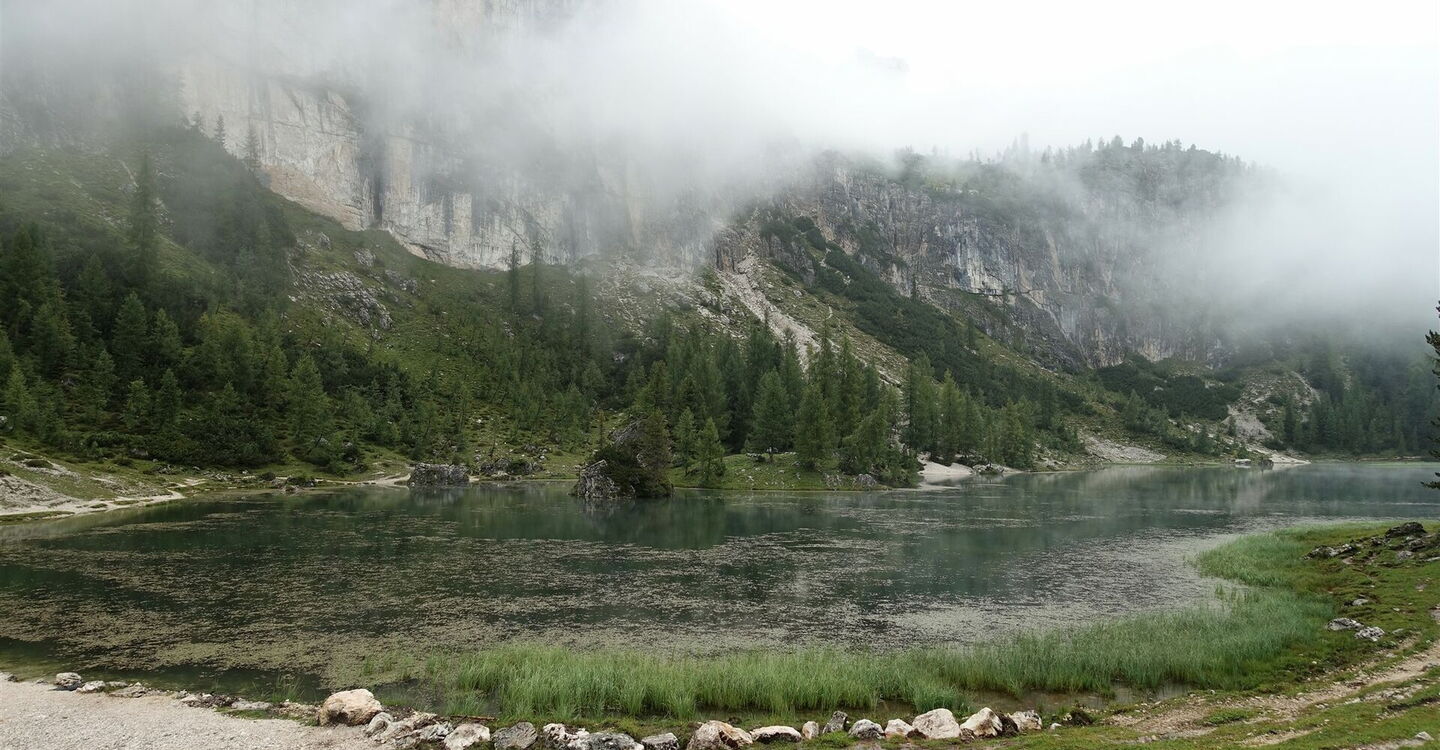 Kurzfristig geht es steil einen bewaldeten Berghang hinauf, um dann auf einer Hochebene durch den lichten Fichtenwald bis an das nördliche Ufer des Lago Fedéra zu gelangen. Steigt man an dieser Stelle einige Meter zum See herunter, so ergibt sich in südliche Richtung ein wunderschöner Blick über den See und auf den 2.603 m hohen Becca di Mezzodi – dahinter taucht der Gipfel des Monte Pelmo aus dem Dunst auf. Hat man etwas Zeit mitgebracht, so kann man an dieser Stelle rechts um den See herumgehen. Ansonsten marschieren wir auf dem breiten und von malerischen Zirpen umgebenen Hauptweg am Ostufer des Lago Fedéra bis zum 05 Rifugio Croda da Lago (2.046 m).