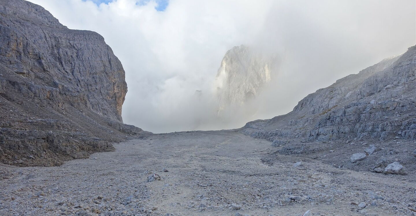 Nach kurzem Abstieg erreichen wir den 02 Passo di Pradidali Basso (2.658 m). Hier befindet sich auch wieder ein Wegweiser. Wir steigen in südwestlicher Richtung auf dem Wanderweg 709 Richtung Rifugio Pradidali ab. Es geht durch ein spektakulär geformtes Kar, rechts und links steigen steil die Dolomitenwände in die Höhe.