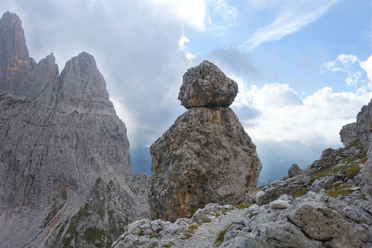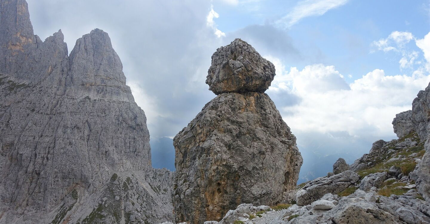 Hinter diesem leichten Klettersteig folgt noch einmal ein steiler Aufstieg zum 04 Passo di Ball (2.443 m). Rechts vom Pass erhebt sich der 2.744 m hohe und turmartige Felsgipfel Campanile Pradidali. Links vom Pass befindet sich die 2.731 m hohe Cima Pradidali. Wir übersteigen den Pass und folgen weiterhin dem Wanderweg 715, nun durch eine kesselförmige Eintiefung. Bei guter Sicht kann man dann bereits das Rifugio Pradidali ausmachen, umgeben von den wohl schönsten Bergspitzen der Pale di San Martino.