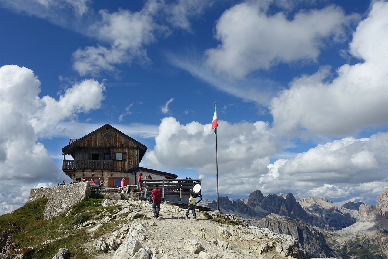 Vom Sessellift und dem Rifugio Averau an der Forcella Nuvolau steigen wir in östlicher Richtung auf dem Wanderweg 439 gemächlich über einen Bergkamm bis zum extrem aussichtsreichen Gipfel des Monte Nuvolau auf. Wie ein Adlernest liegt hier das 05 Rifugio Nuvolau (2.575 m).