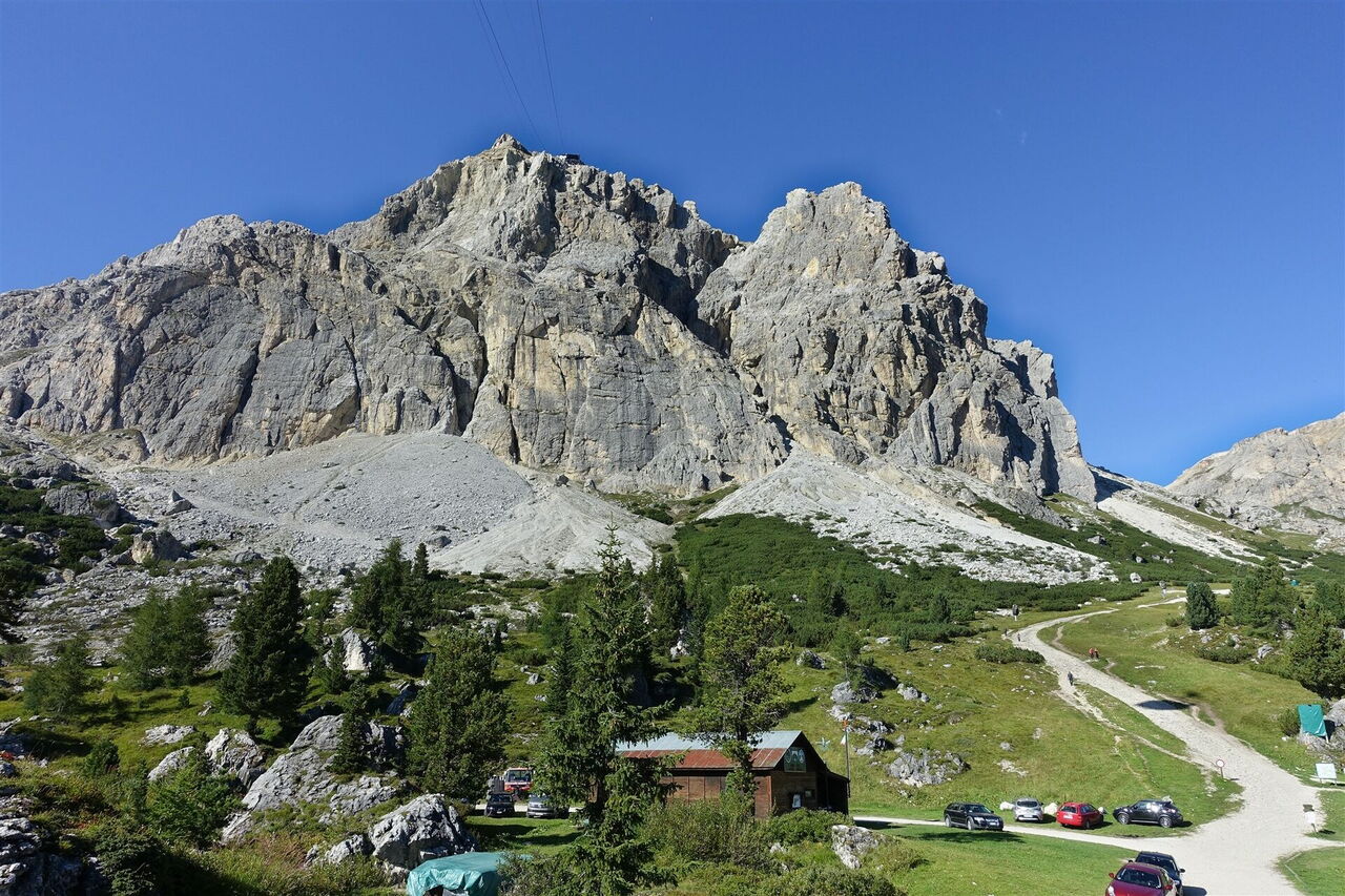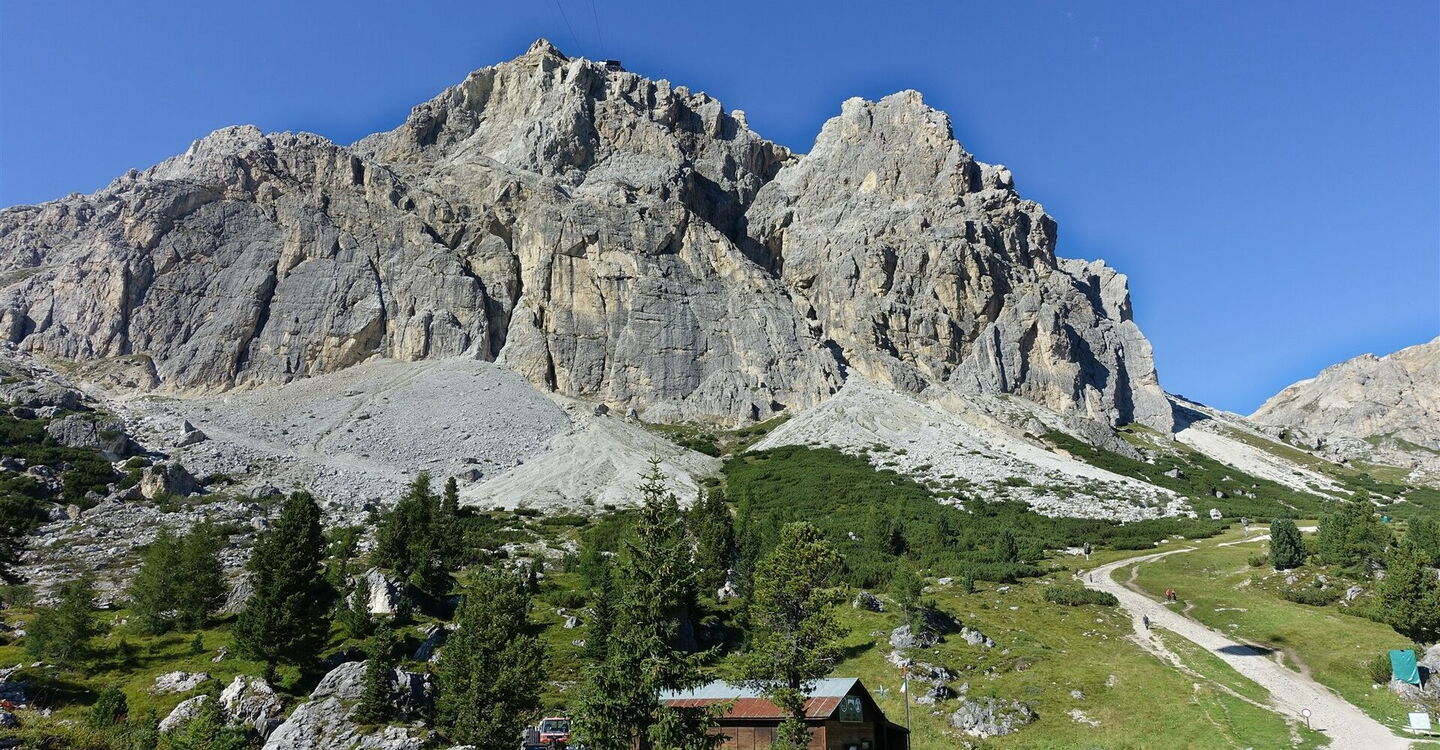 Ca. 225 m hinter einer Holzbrücke, hier macht die Schotterpiste eine scharfe Rechtskurve, gehen wir aber nun geradeaus weiter und orientieren uns dabei an den Wegmarkierungen. Nachdem wir eine felsige Rinne hinter uns gelassen haben, sehen wir die Bergstation eines weiteren Sessellifts. Hier gabelt sich der Wanderweg, wir gehen halb links in Richtung Forcella Nuvolau. Nach steilem Aufstieg gelangen wir in flacheres Gelände und gehen direkt auf große Felsabbrüche vom Monte Averau zu. Im Weiteren geht es dann auf einem Schotterband, unterhalb der steil abfallenden Südwände des Monte Averau, bis zum Rifugio Averau an der 04 Forcella Nuvolau (2.416 m).
