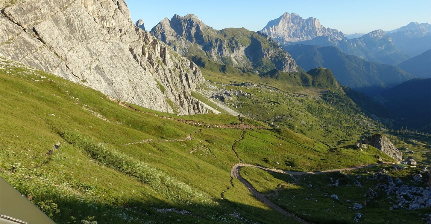 Sobald wir wieder Bergwiesen erreichen, wird der Pfad zum breiten Wanderweg. Vor einem großen Haus mündet von scharf links der Wanderweg 444 in den unsrigen. Dieser kommt vom Rifugio Cinque Torri und dem Klettersteig Via Ferrata Ra Gusela (Wanderweg 438). Auf dem breiten Wanderweg geht es bequem zum 05 Passo Giau (2.236 m) mit dem gleichnamigen Berggasthof.