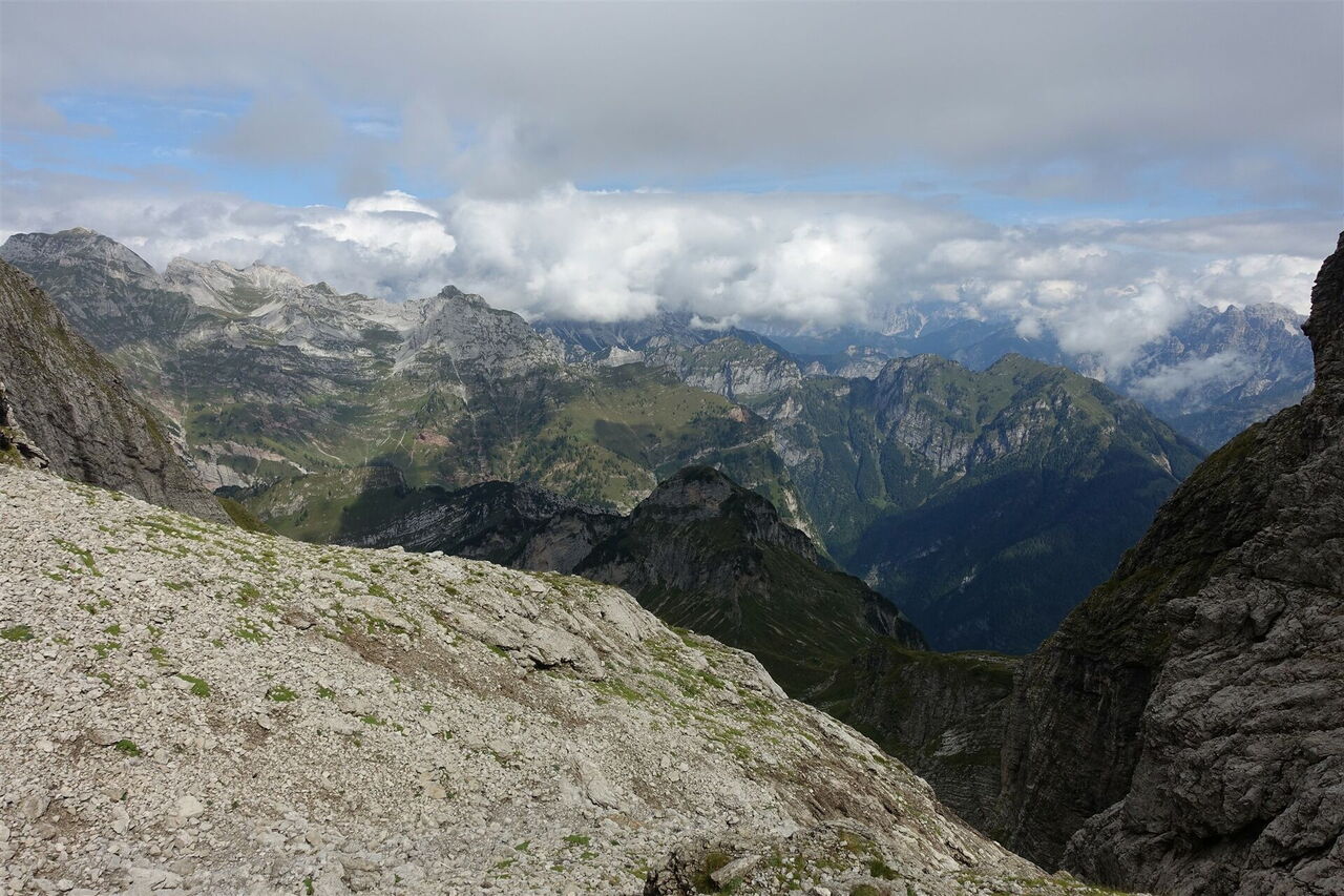 Wir erreichen die 02 Forcella La Varetta (1.704 m), rechts geht es zu der Casera La Varetta, wir gehen aber links Richtung Forcella del Marmol. Wir wandern auf einem extrem steil abfallenden, mit Gras bewachsenen Berghang. Unterhalb sieht man das Rifugio Furio Bianchet, direkt vor uns erhebt sich der mächtige Felskloß des 2.565 m hohen Schiara.