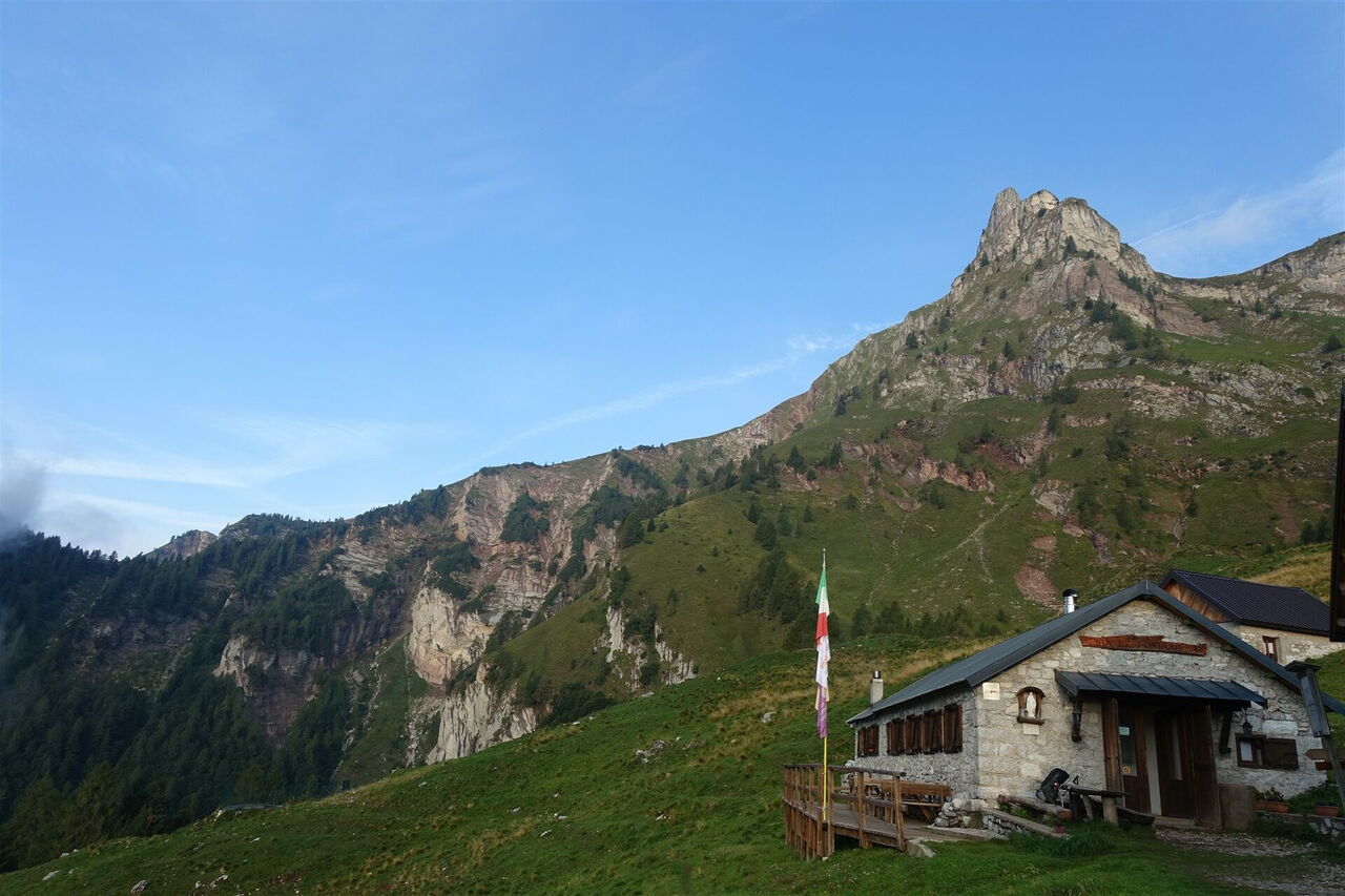 Vom 01 Rifugio Plan de Fontana (1.632 m) führt der Wanderweg 514 Richtung Casera La Varetta, zunächst über Graswiesen, später durch den Wald. Nach einem Abstieg von gut 100 Höhenmetern ignorieren wir den linken Abzweiger und folgen weiterhin dem Wanderweg 514, nun wieder bergauf.