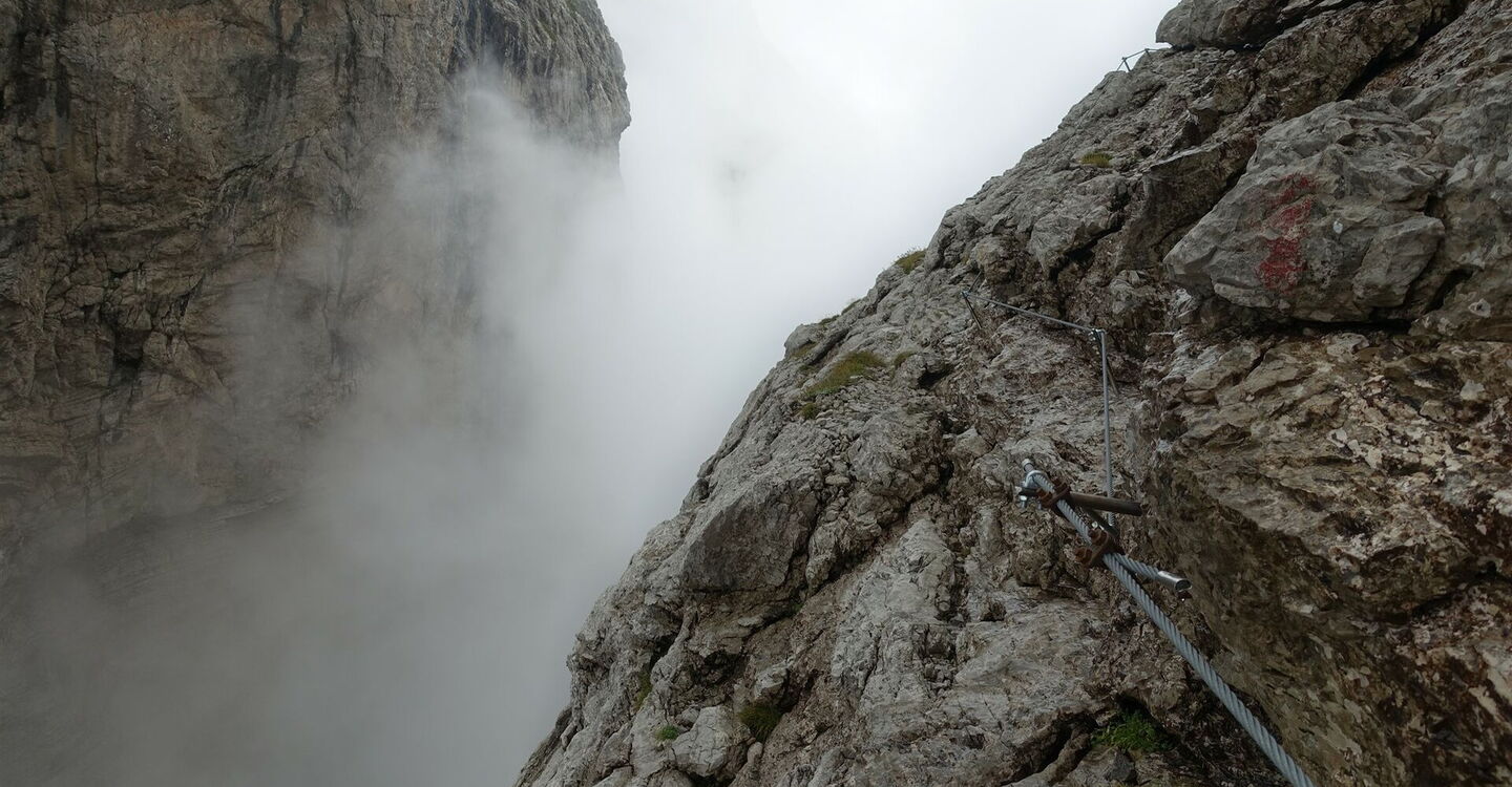 Von nun an wird das Klettersteigset angelegt, um durch die Ostwand des Schiaras aufzusteigen. Es geht über einen gesicherten Klettersteig/Felsstufen und Schrofengelände. Bei ca. 2.360 Höhenmetern erreichen wir den Scheitelpunkt der heutigen Etappe, rechts zweigt der Aufstieg zum Gipfel des Schiaras ab. Für den Abstecher über den zunächst noch breiten Rücken und den nachfolgenden Nordostgrat (Schwierigkeitsgrad I) benötigt man ca. 1¼ Stunden. Nach weiterem Abstieg entlang einer breiten Felsspalte erreichen wir das knallrote 05 Bivacco del Màrmol (2.266 m).