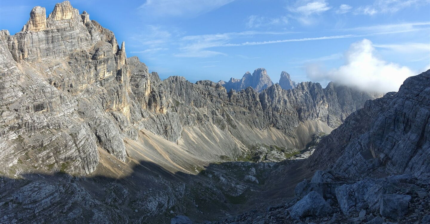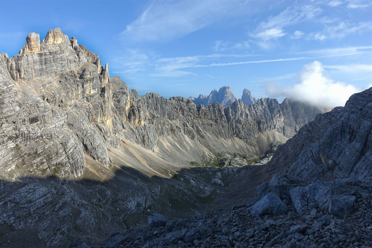"Früh mit den Hühnern zu Bette und auf mit dem Hahn um die Wette" ist ein deutsches Sprichwort und die Ansage für den heutigen Tag. Von dem in einem Kessel eingeschlossenen 01 Rifugio Vandelli (1.928 m) marschieren wir auf dem Wanderweg 215 und dem Wanderweg 242 Richtung Via Ferrata Berti und Bivacco Slataper.