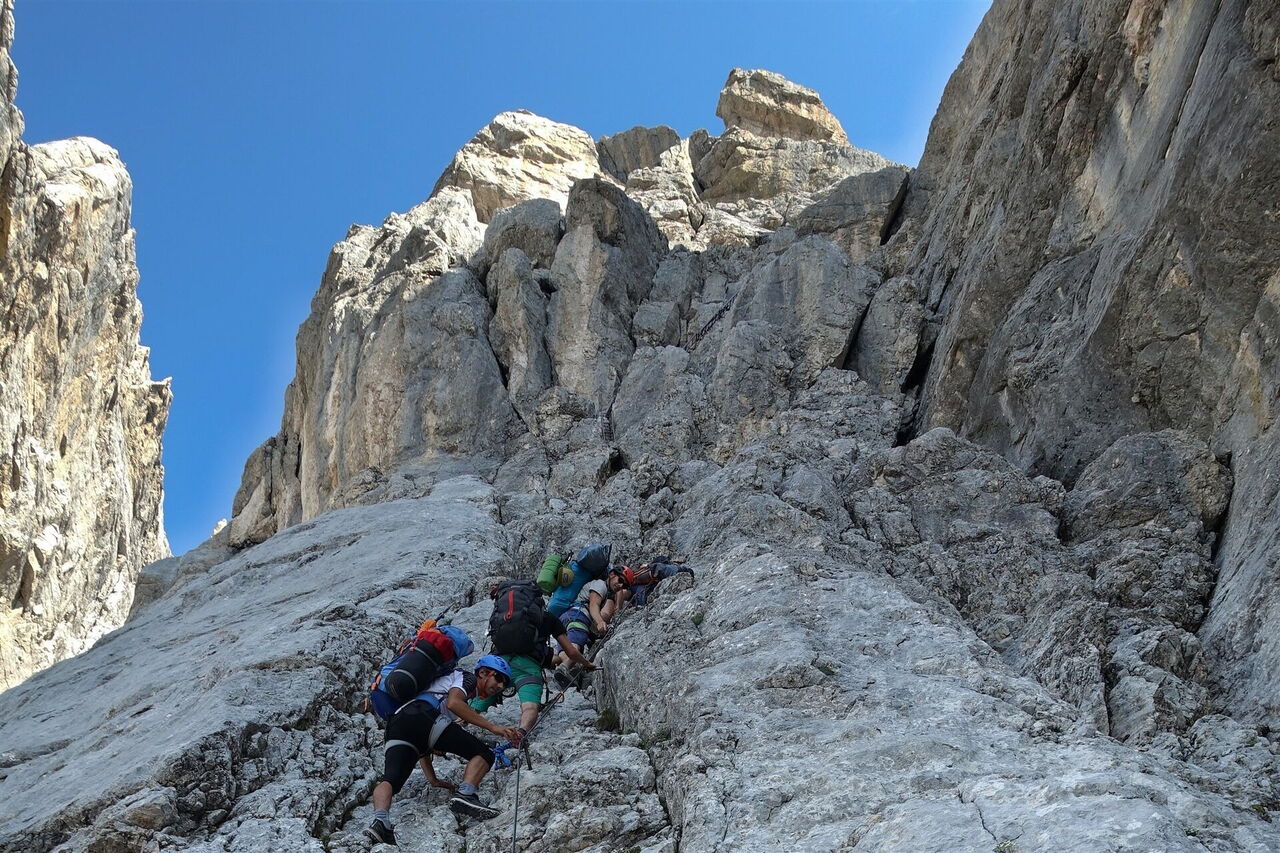Zum krönenden Abschluss geht es dann auf einem sehr schmalen Felsband inmitten einer senkrecht abfallenden Felswand – zum Glück an einem durchlaufenden Sicherungsseil – bis zur Forcella del Bivacco hoch, dem höchsten Punkt der heutigen Etappe. Von dort geht es auf dem Wanderweg 246 nur noch wenige Meter bergab bis zum 05 Bivacco Slataper (2.600 m).