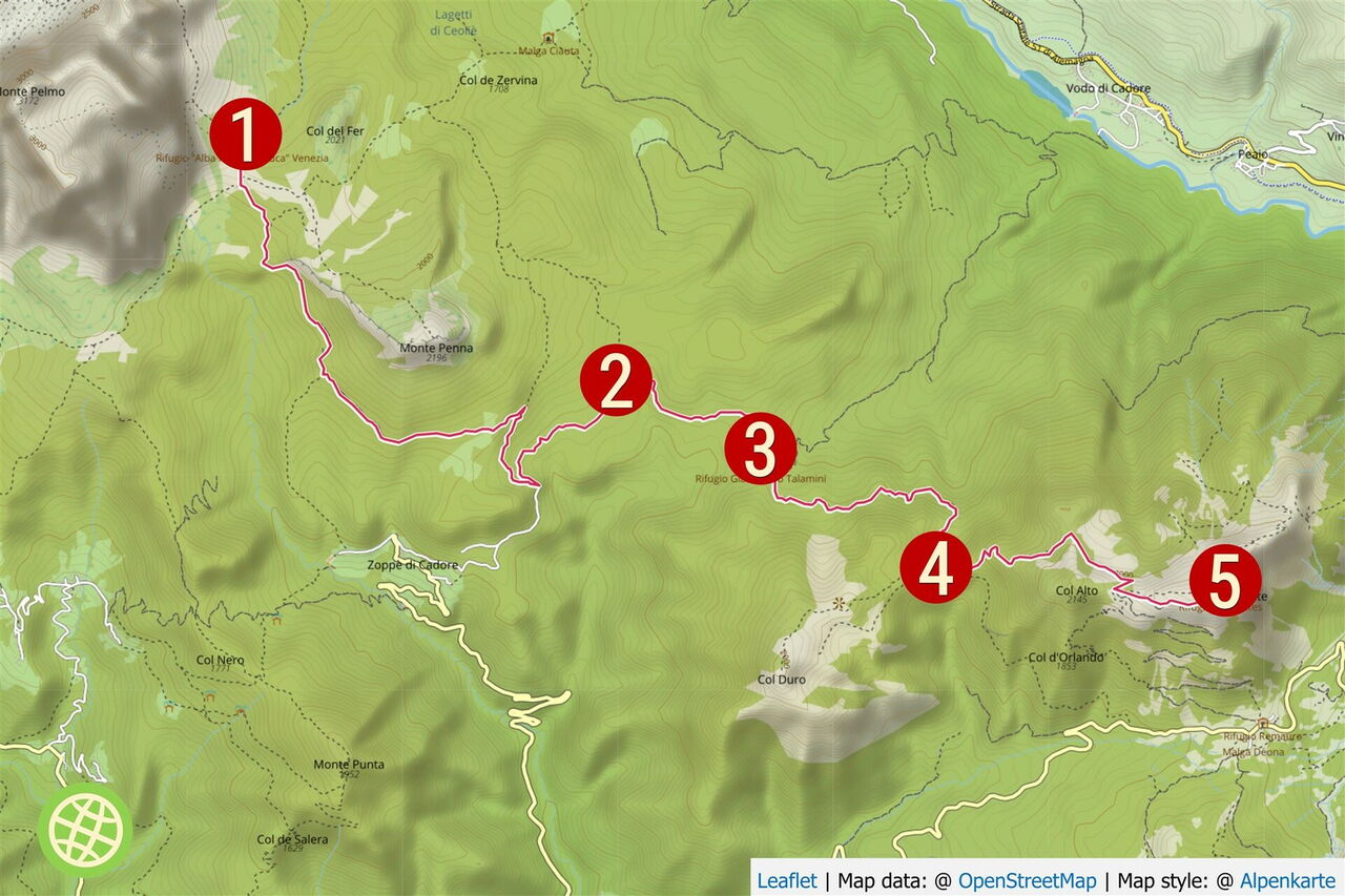 Startpunkt: Das Rifugio Venezia ist nur zu Fuß erreichbar und befindet sich am Ende der Tour 64. Endpunkt: Das Rifugio Dolomites ist nur zu Fuß erreichbar und befindet sich am Anfang der Tour 66.