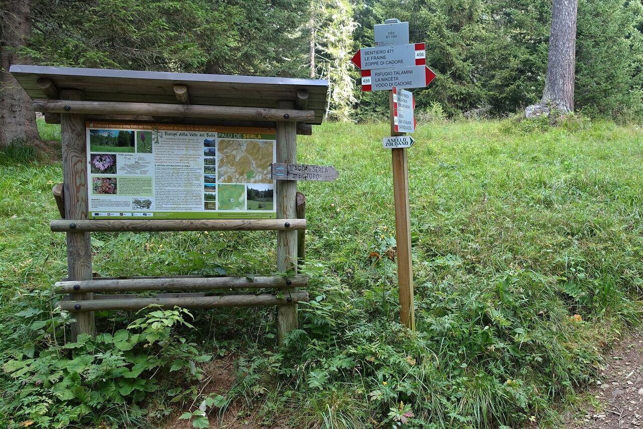 Bei einem Heiligenschrein durchläuft die Piste eine Linkskehre. Rechts führt ein Pfad Richtung Zoppe de Cadore, wir gehen aber auf der Piste weiter und kommen nur kurz später an der Ruine eines Hauses und einem alten Holzhaus vorbei. Bei mehreren Wegweisern folgen wir der bergab führenden Piste durch die scharfe Rechtskehre. Wir befinden uns nun ein kurzes Stück auf dem Wanderweg 493. Anschließend erreichen wir eine Straße mit einer Parkbucht, an der wir scharf links gehen, nun auf dem Wanderweg 456 Richtung Rifugio Talamini. Ca. 1,45 km bleiben wir nun auf dieser Straße – teils Piste –, bis wir den Wegpunkt 02 Sentiero (1.599 m) erreichen. Hier mündet von links die Tour 65 in unseren weiteren Weg.