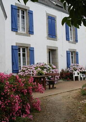 Mit der Kirche im Rücken biegen wir rechts in die Rue de Chapellendy ein und gehen bis zu einem großen Steinkreuz vor, um dort links abzubiegen. Bei einem weiteren Steinkreuz gehen wir durch die Rechtskurve der Straße und dann durch die Linkskurve in Richtung der Ortschaft Bouges. Hinter dem letzten Haus der Streusiedlung geht es auf einem Wirtschaftsweg weiter. Bei der nächsten Weggabelung gehen wir halb rechts in den Wald herunter. An der darauffolgenden Straße gehen wir links und kommen an einem ersten Kreuz vorbei, um dann bei der nächsten Möglichkeit, hinter dem zweiten 02 Steinkreuz (118 m), rechts abzuzweigen – auch ausgeschildert nach Kerever. Am Ende der Straße, inzwischen sind wir durch drei kleine Streusiedlungen gegangen, gehen wir um das Steinhaus mit den hellblauen Fensterläden herum, um dann bei der ersten Weggabelung rechts im Wald bergab zu gehen.