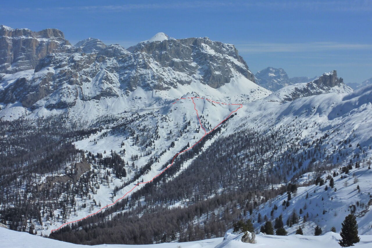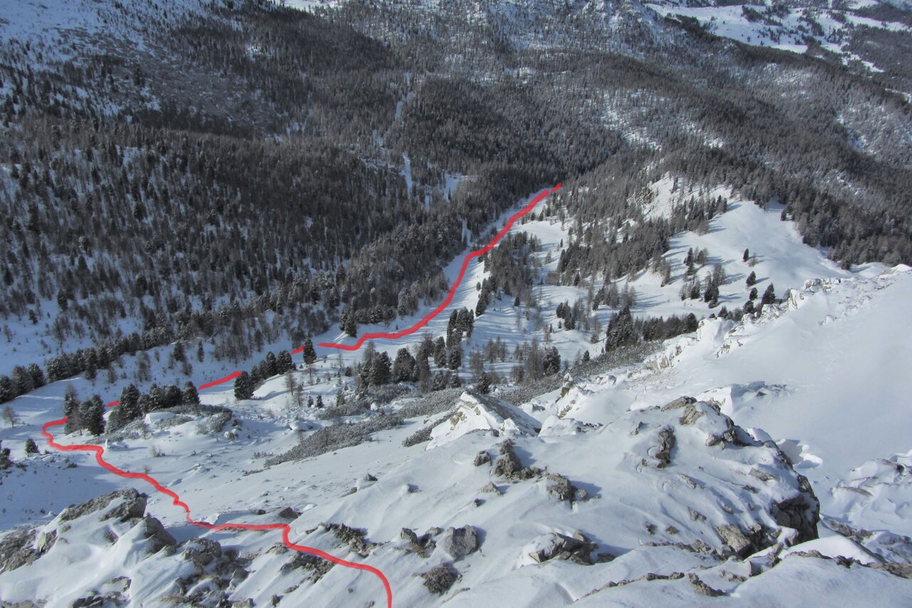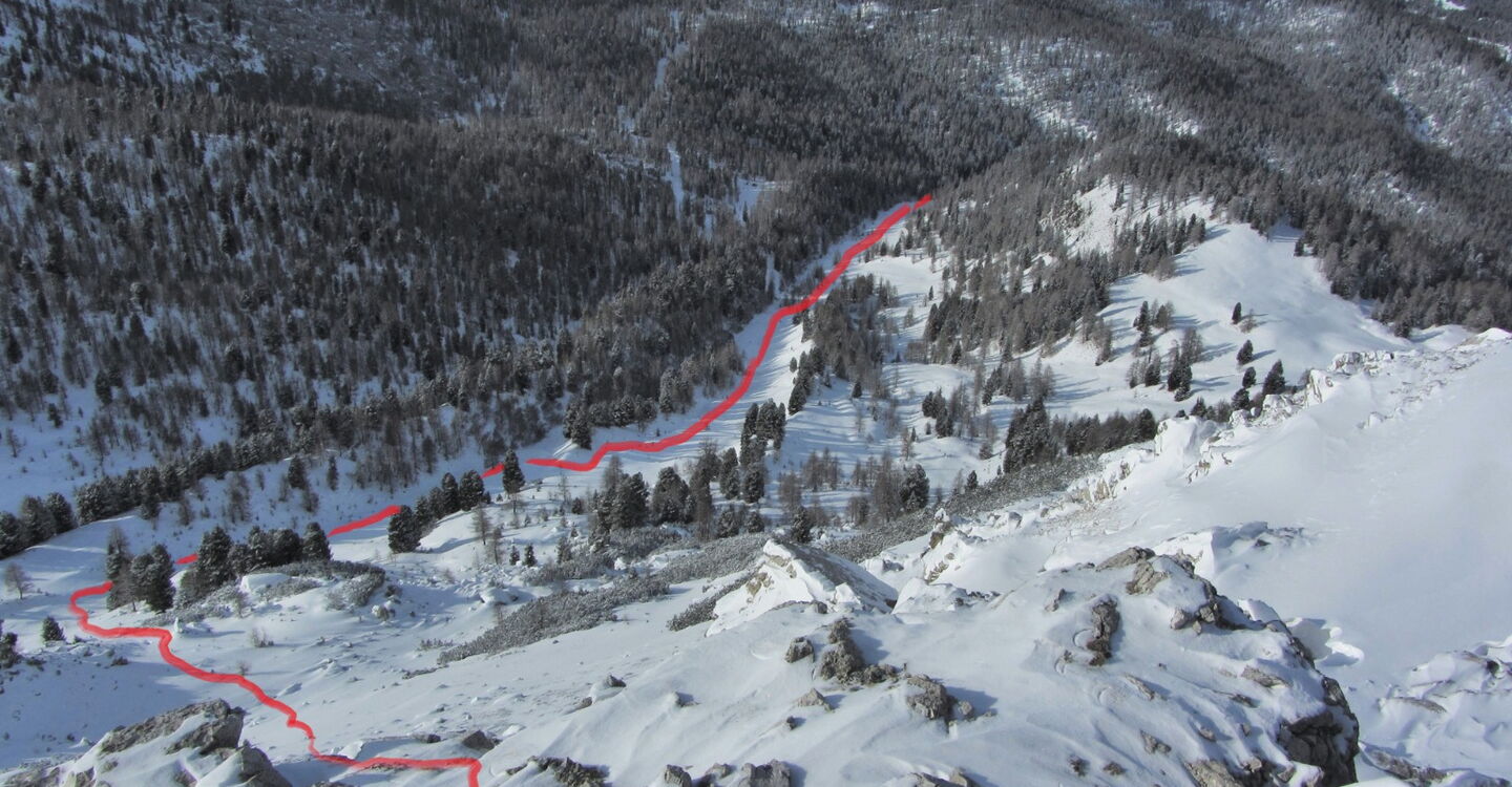 Je nach Schneebedingungen kann man mehrere Varianten nehmen, bis man automatisch in die weiße Rinne der Pra de Ciamena kommt, die bis in den Talgrund führt.