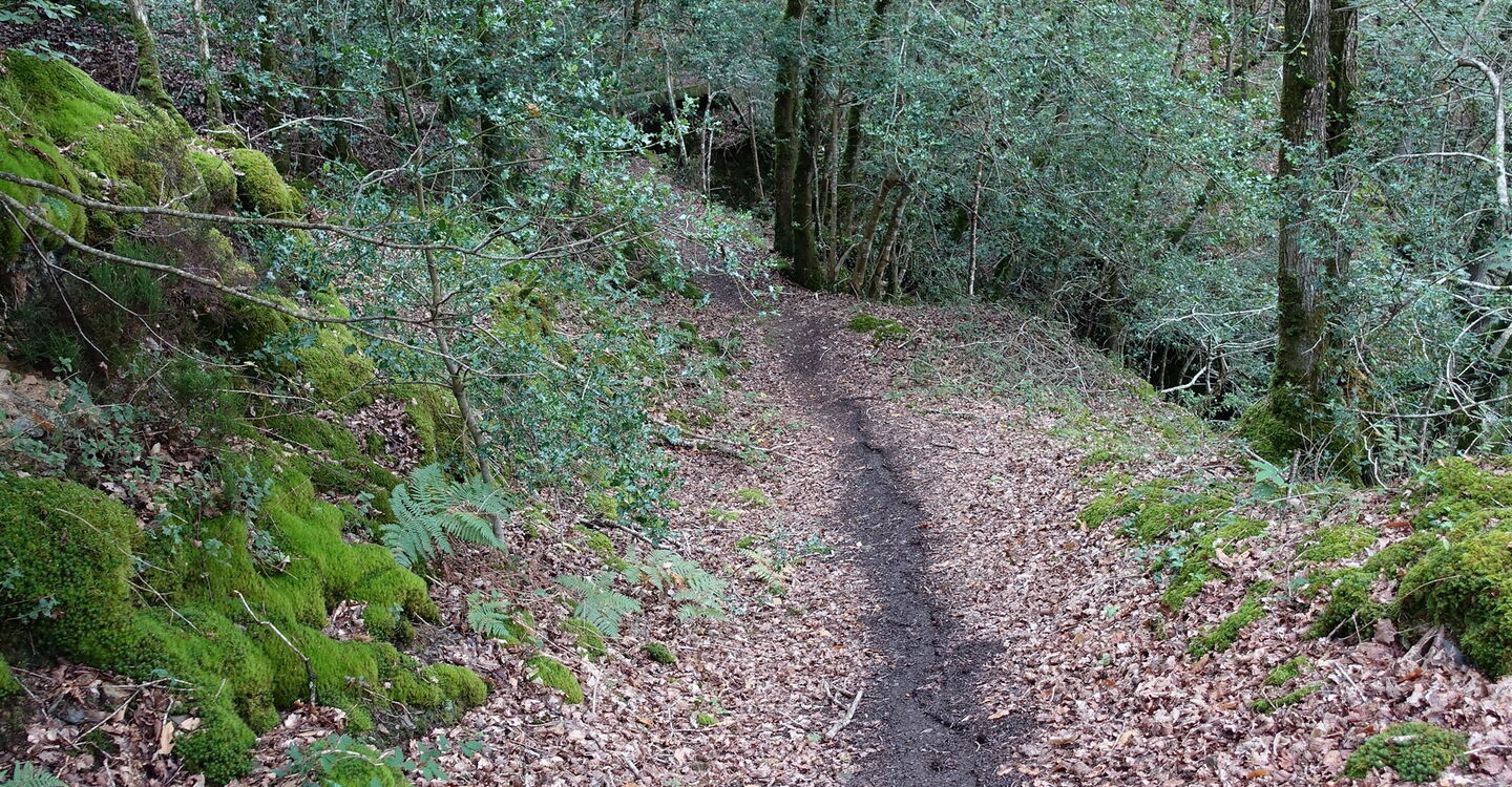 Wir durchqueren eine Streusiedlung und überqueren zwei aufeinanderfolgende asphaltierte Straßen. Nachdem wir eine weitere Straße gequert haben, gehen wir noch bis zum Ende der Piste vor, dann links bergab und an dem 20-km/h-Schild vorbei. Hinter einem urwaldähnlichen Wegabschnitt erreichen wir den Fluss 02 Aulne Maritime (3 m). Schauen wir nach rechts, so sehen wir in der Ferne eine Hängebrücke. Wir gehen 50 m zurück, um an der Stelle, wo von links ein Wanderweg kommt, rechts durch das Holzgatter zu gehen und dann halb rechts auf der Fahrspur weiterzuwandern. Hinter einem Holzhaus gehen wir halb rechts auf einem Pfad weiter, der etwas erhöht über dem Flussbett verläuft.