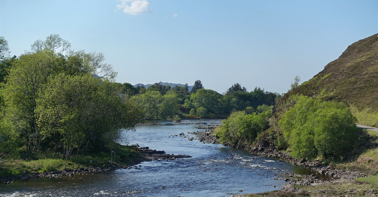 Zunächst führt die Piste am Südende des Loch Kernsary vorbei und dann durch einen schönen Laubwald mit gigantischen farbenfrohen Rhododendren, der sich auf dem Gelände der luxuriösen Inveran Lodge befindet. Hinter einem Warnschild mit der Aufschrift "Blind Corners" führt links ein Weg herunter zum 05 Fluss Ewe (14 m). An dieser Stelle ist er leicht gestaut und lädt an warmen Tagen zu einem erfrischenden Bad ein. Der verbleibende Weg zum Ausgangspunkt führt auf der asphaltierten Privatstraße am zunehmend schneller fließenden Fluss entlang.