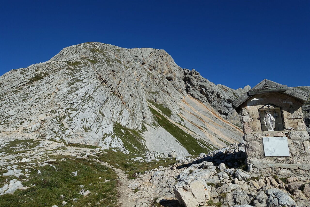 Wir erreichen die 02 Ofenscharte (2.380 m) mit dem gemauerten Marienbildstock.