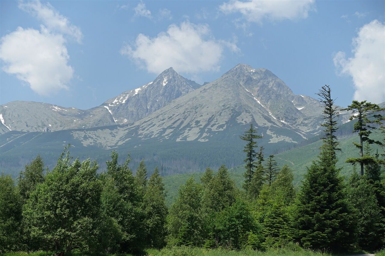 Auf dem zunehmend breiter werdenden Weg geht es bis zum Parkplatz und der 05 Bushaltestelle (925 m) an der Hauptstraße gemächlich bergab. Dreht man sich um, so blickt man auf die Bergwelt mit dem Lomnický štít und der Nebenspitze, dem Kežmarský štít.