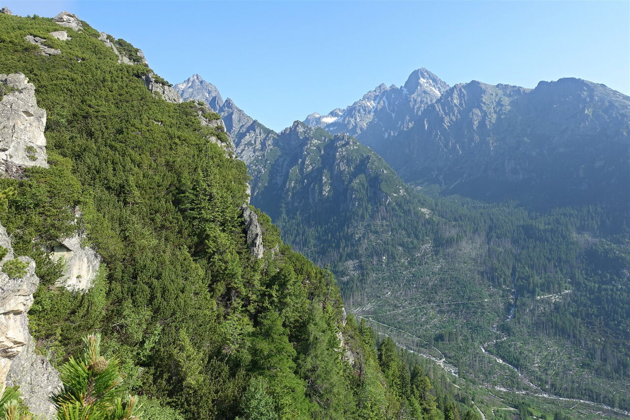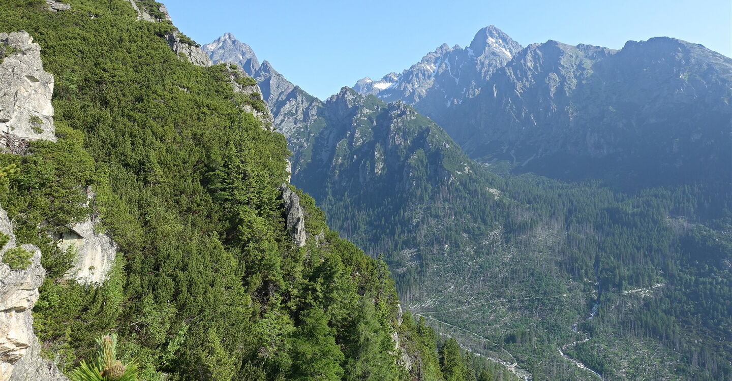 Der blaue Wanderweg wird steiler und führt durch einen schattenspendenden Wald mit hochgewachsenen Latschenkiefern zu dem wunderschönen Aussichtspunkt 03 Slavkovská výhliadka (1502 m). Tief schaut man in das Veľká Studená Dolina (großes kaltes Tal) herunter und bewundert dabei rauschende Wasserfälle (siehe Tour 54). Dahinter erhebt sich der 2634 m hohe Lomnický štít, bei guter Sicht kann man die Bergstation der Seilbahn erkennen. Noch einmal der Hinweis: In der Zeit vom 1. November bis zum 14. Juni eines Jahres ist der nun folgende Wegabschnitt aus Naturschutzgründen geschlossen.