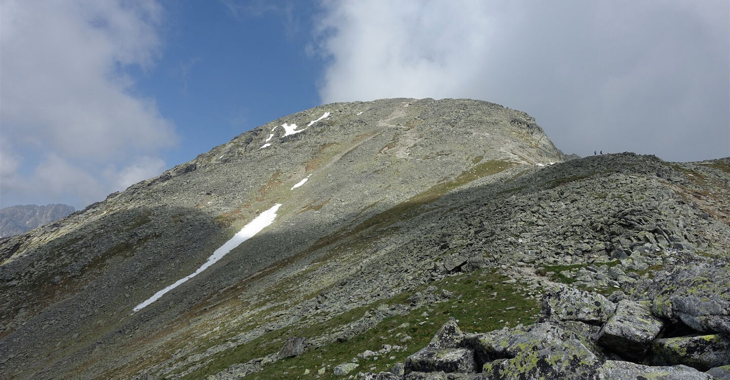 In Serpentinen durch Latschenkiefern erreichen wir einen Berggrat, der sich nun kontinuierlich in Richtung des Vorgipfels 04 Slavkovský nos (2273 m) schlängelt. Weiterhin bietet sich ein faszinierender Blick auf die Bergwelt nördlich von uns. Glück dem, der schönes Wetter hat!