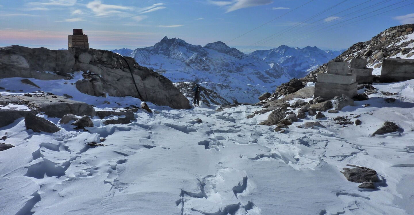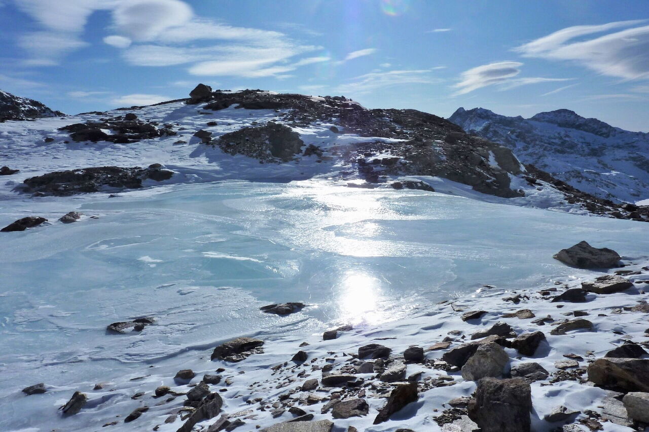 Bei der Bergstation der Seilbahn Nr. 26 Passo dei Salati Indren fahren wir gleich rechts, aber nicht unter der Seilbahn hindurch. Nach 600 m umfahren wir rechts einen gefrorenen Gletschersee.