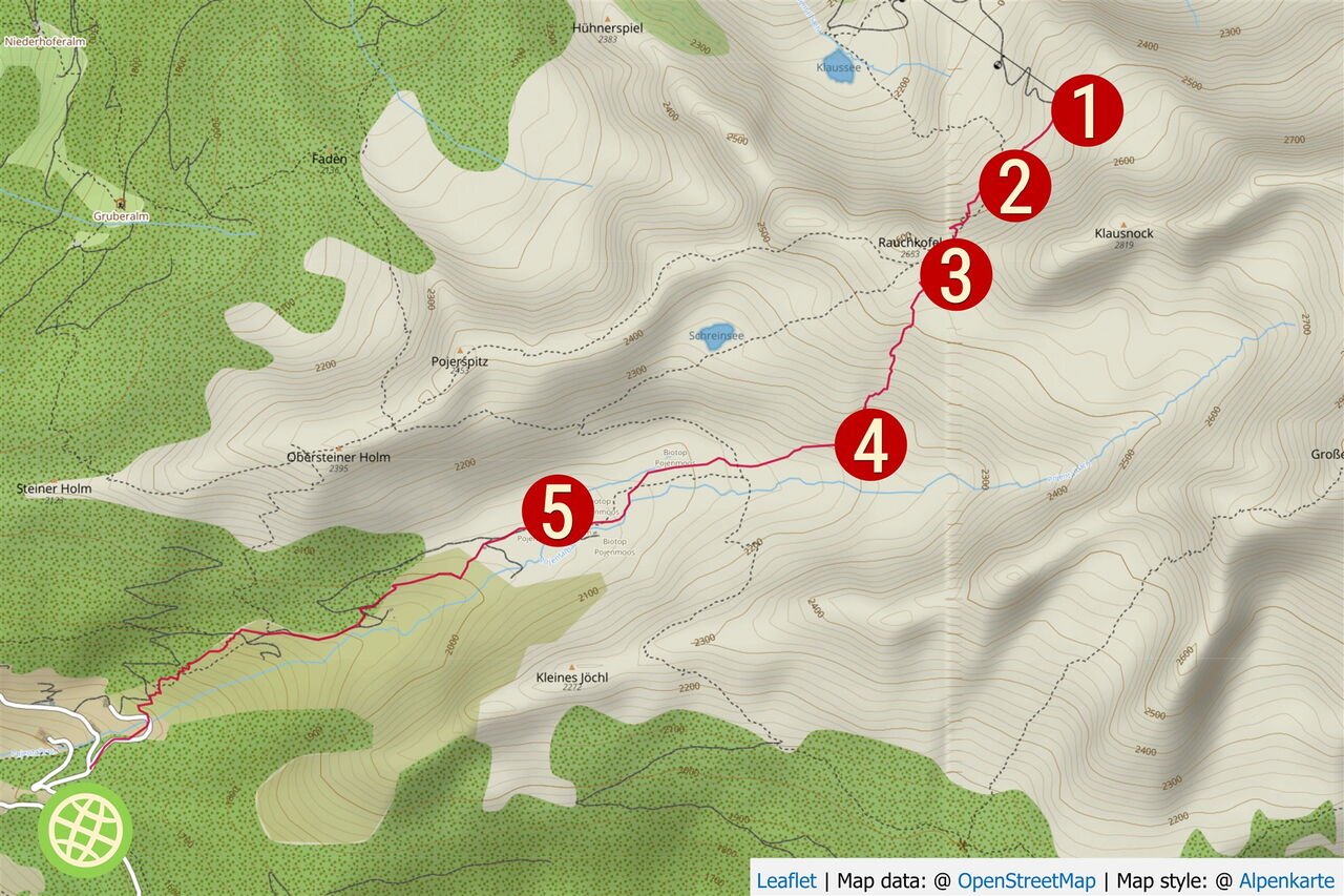 Geokoordinaten zum Start 46.9388 11.9524. Sie führen Dich zum Parkplatz am Skigebiet Klausberg.