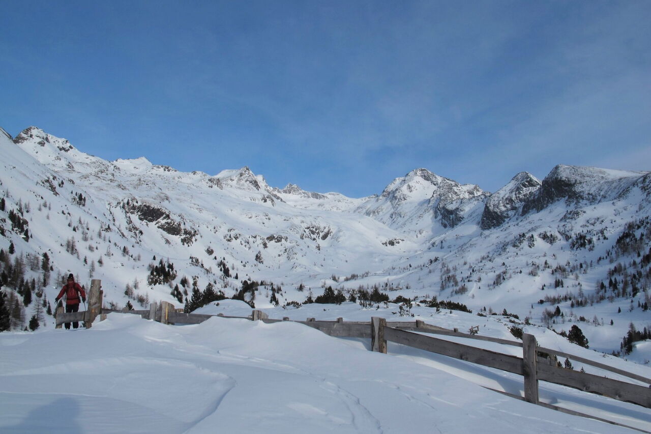 Die Tour beginnt an der Bergstation der Kabinenbahn Klaussee 2. Wir verlassen gleich links die Piste und queren in den Hang, bis wir auffellen, um in Kehren auf das Klausjoch zu steigen.