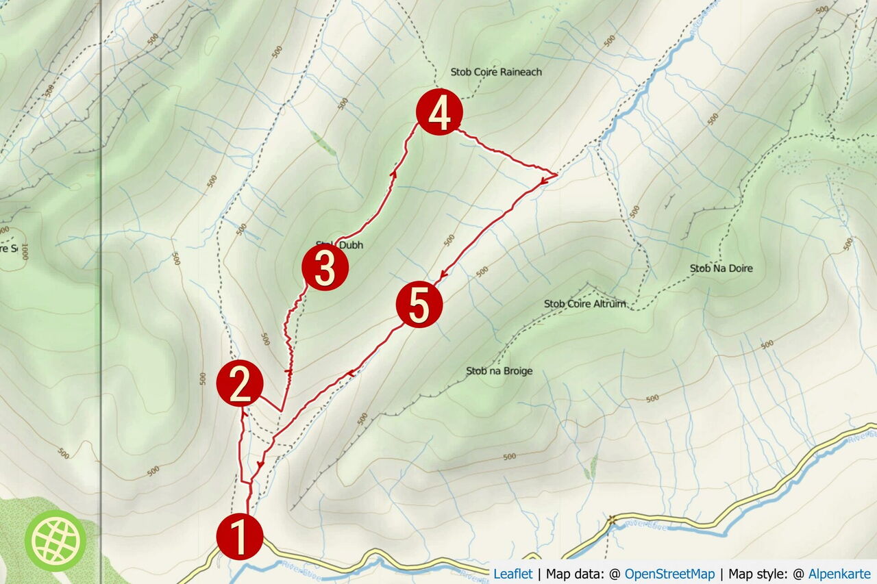 Mittelschwere Wanderung, nur an einer Schlüsselstelle ist die Wegführung unklar und man muss intuitiv den Weg finden. Art des Weges: 10 % Straße und 90 % angelegter Pfad. Zusatzausrüstung: Wanderstöcke. Einkehr: Keine auf der Wanderung. Beste Wanderzeit: Mai bis September. Sehenswert Region: Buachaille Etive Mòr Waterfalls, Entfernung: 9 km, Geokoordinaten 56.647753 -4.865793.