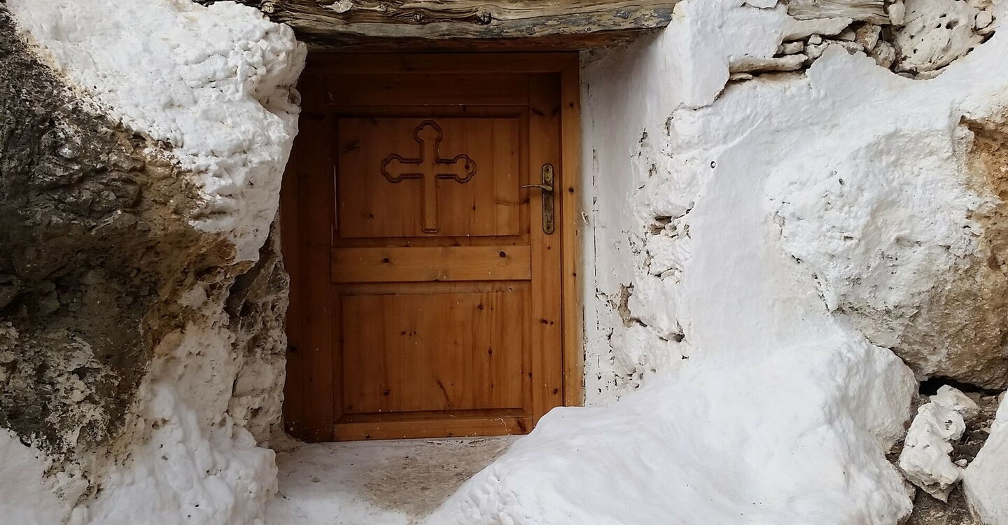 Beim Abstieg über die fruchtbaren Felder staunen wir über die atemberaubenden Ausblicke auf die vorgelagerten Inseln und freuen uns auf ein erfrischendes Bad in der Ägäis. Nach so viel Natur folgt ein bisschen Kultur, wir erreichen die Grotte von Amarthos. Unter einem riesigen Felsblock befindet sich eine niedrige Höhle. Ein Teilbereich ist zugemauert und wurde zu einer Kapelle umgestaltet. Das Außergewöhnliche: In dieser extrem trockenen Region tropft es von der Decke in Blechwannen. Unweigerlich fragt man sich, wo das Wasser herkommt. Es haben sich Tropfsteine gebildet, wovon einer tatsächlich, mit viel Einbildung, wie eine Frauenbrust aussieht. Damit hat das Ganze nun eine besondere Bedeutung und ein Ikonenbildchen zeigt das auch. Auf diesem hat die Mutter Maria ihr Kleid geöffnet und gibt dem Jesuskind eine Brust zum Trinken. Das ist nun kein gewöhnliches Wasser, das da von der Decke tropft, sondern "Milch der Mutter Gottes".