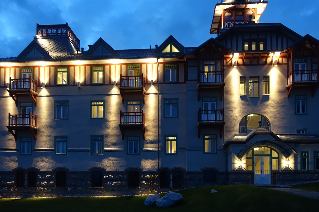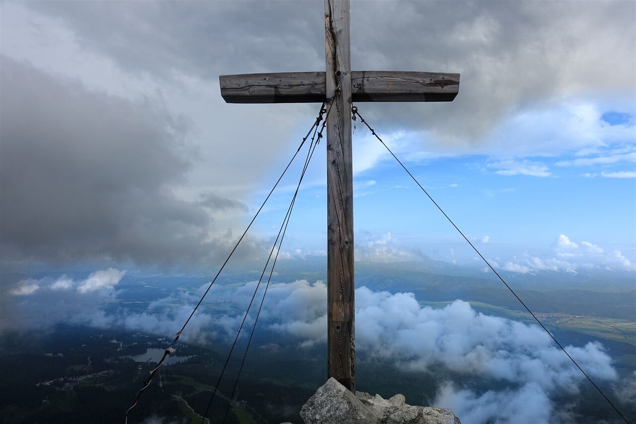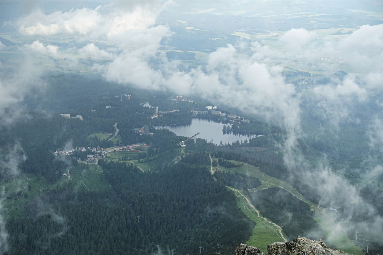 Wir erreichen die Wegekreuzung 05 Škutnastá poľana (1710 m), gehen ein langes Wegstück links bergab und folgen der Ausschilderung Richtung Štrbské Pleso. Zwischenzeitlich kommen wir an einer einzelnen Hütte vorbei. Unser Pfad mündet in einen Karrenweg, dem wir links bergab folgen. Fast auf gleicher Höhe sehen wir die große Sprungschanze. Einen nach links abzweigenden Pfad zum unterhalb liegenden See ignorieren wir und bleiben auf dem breiten Karrenweg. Auf der nachfolgenden Straße gehen wir dann an der Rückseite des Hotels Solisko und des Hotels Kempinski vorbei und erreichen an einer gepflasterten Straße rechteckige Apartmenthäuser. Nach rechts führt ein blau markierter Treppenweg herunter in den Ort und weiter zum Bahnhof.
