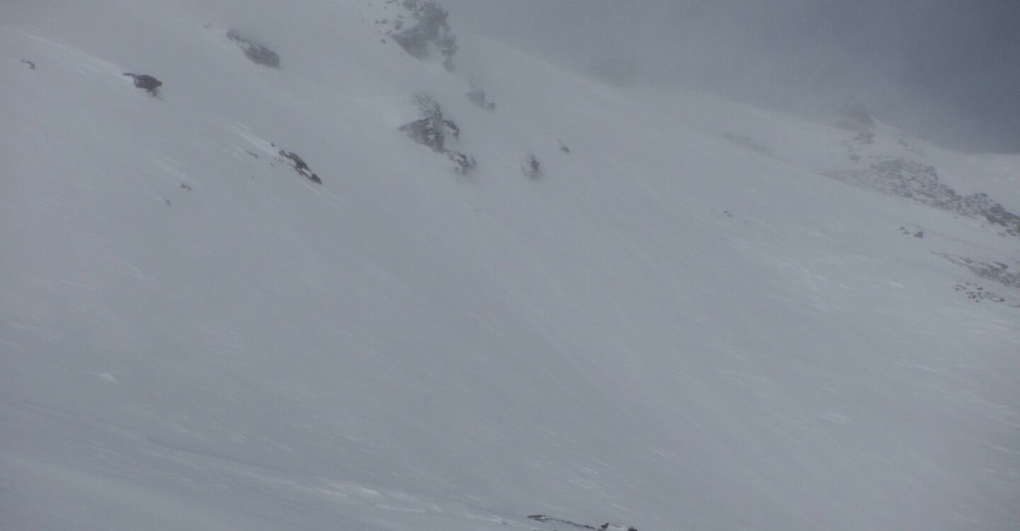 Plötzlich hatten wir einen Wolkendeckel ab 2.900 m und eine damit verbundene sehr schlechte Sicht. Die 60 cm Neuschnee vom Vortag wurden innerhalb kürzester Zeit irgendwohin verfrachtet.