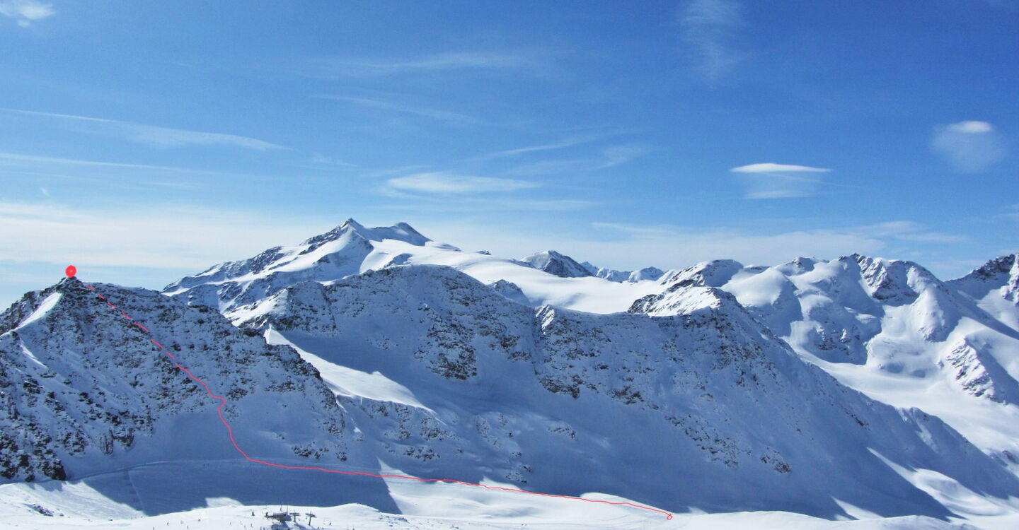 Bei der Bergstation des Lifts D Schöntauf 2 fahren wir rechts auf der Piste bergab, bis wir nach 500 m in einer Rechtskurve geradeaus fahren, um nun links 20 hm zum Madritschjoch zu steigen.