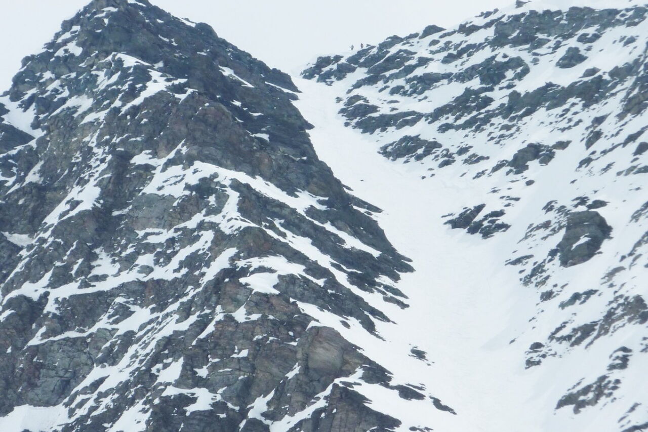 Mein Bergführer Hubert hatte das "Lawinen-Panik-Gesicht". Wir haben die Abfahrt durch die Scharte, wie im Bild gezeigt, nicht gemacht und sind den gleichen Weg zurückgegangen.