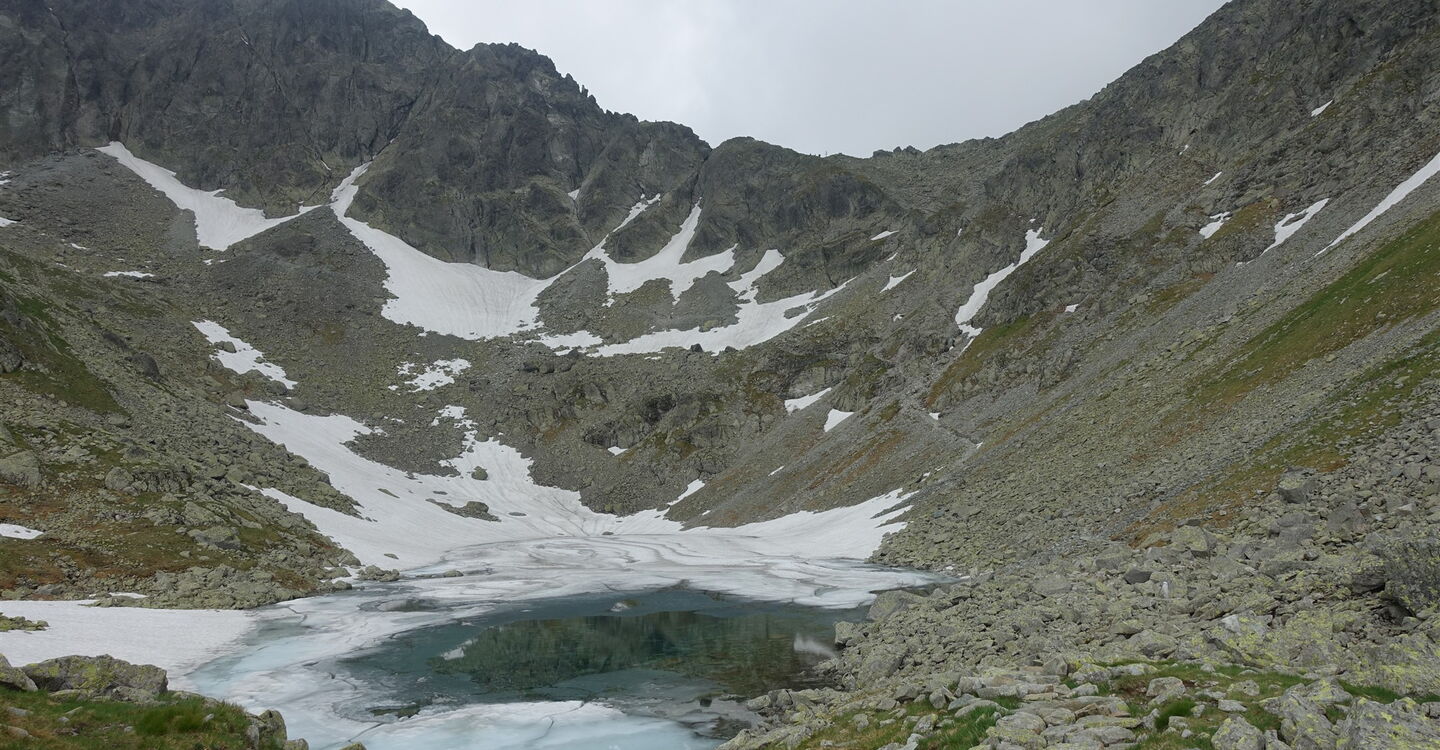 Nach abermals steilem Aufstieg erreichen wir ein mit Schutt bedecktes Tal, in dem sich ein weiterer See befindet, der an mehr als 270 Tagen im Jahr mit Eis bedeckt ist. Durch dieses Kar steigen wir bis zu einer Weggabelung mit Wegmarkierungen auf. Dort wandern wir halb rechts auf dem mit Holztreppen gesicherten Pfad bis zur Einsattelung 03 Poľský hrebeň (2200 m) weiter. Danach geht es über blanke Felsen auf einem mit Ketten gesicherten Abschnitt talwärts, mehrmals müssen die Hände zu Hilfe genommen werden. Dies ist die technisch schwierigste Stelle der Wanderung. Bis Mitte Juni steigt man ein kurzes Stück über Restschneefelder ab. Da in der Regel die Spur sehr ausgetreten ist, benötigt man aber keine Steigeisen.