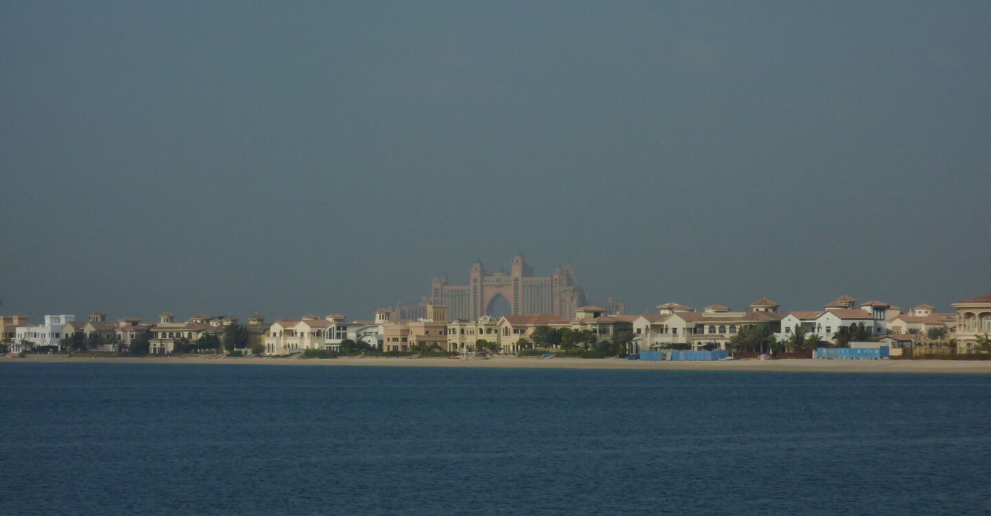 Wie ein majestätisches Tor erhebt sich die Hotelanlage Atlantis mit 1.539 Zimmern, dem eigenen Wasserpark sowie 20 Restaurants und Bars. Seit 2008 zählt es zu einem der Wahrzeichen Dubais.