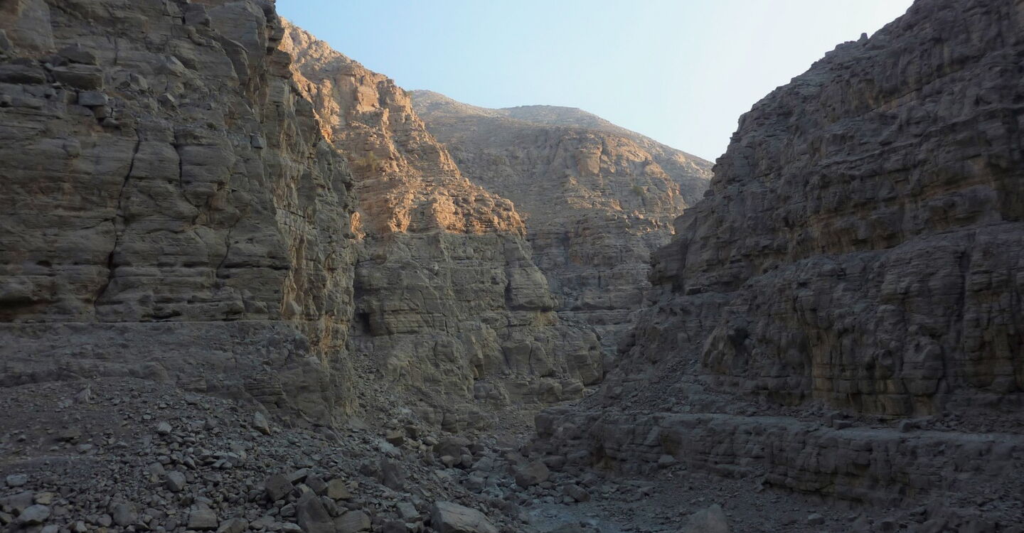 Wir gehen auf einem Pfad ins Wadi Qadah hinein. Die Wände der umliegenden Berge fallen hier bis zu 400 hm senkrecht ab, und der Pfad ist gesäumt mit riesigen Steinblöcken.