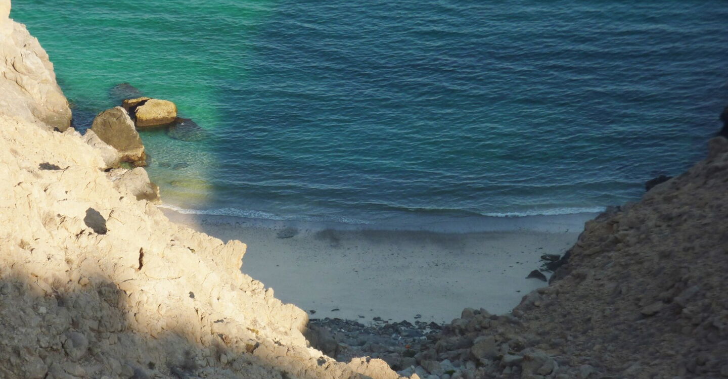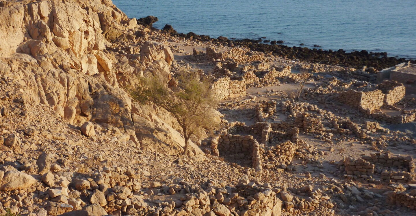 Vom Hotel gehen wir Richtung Norden am Strand entlang, bis wir auf ein altes Steindorf treffen.