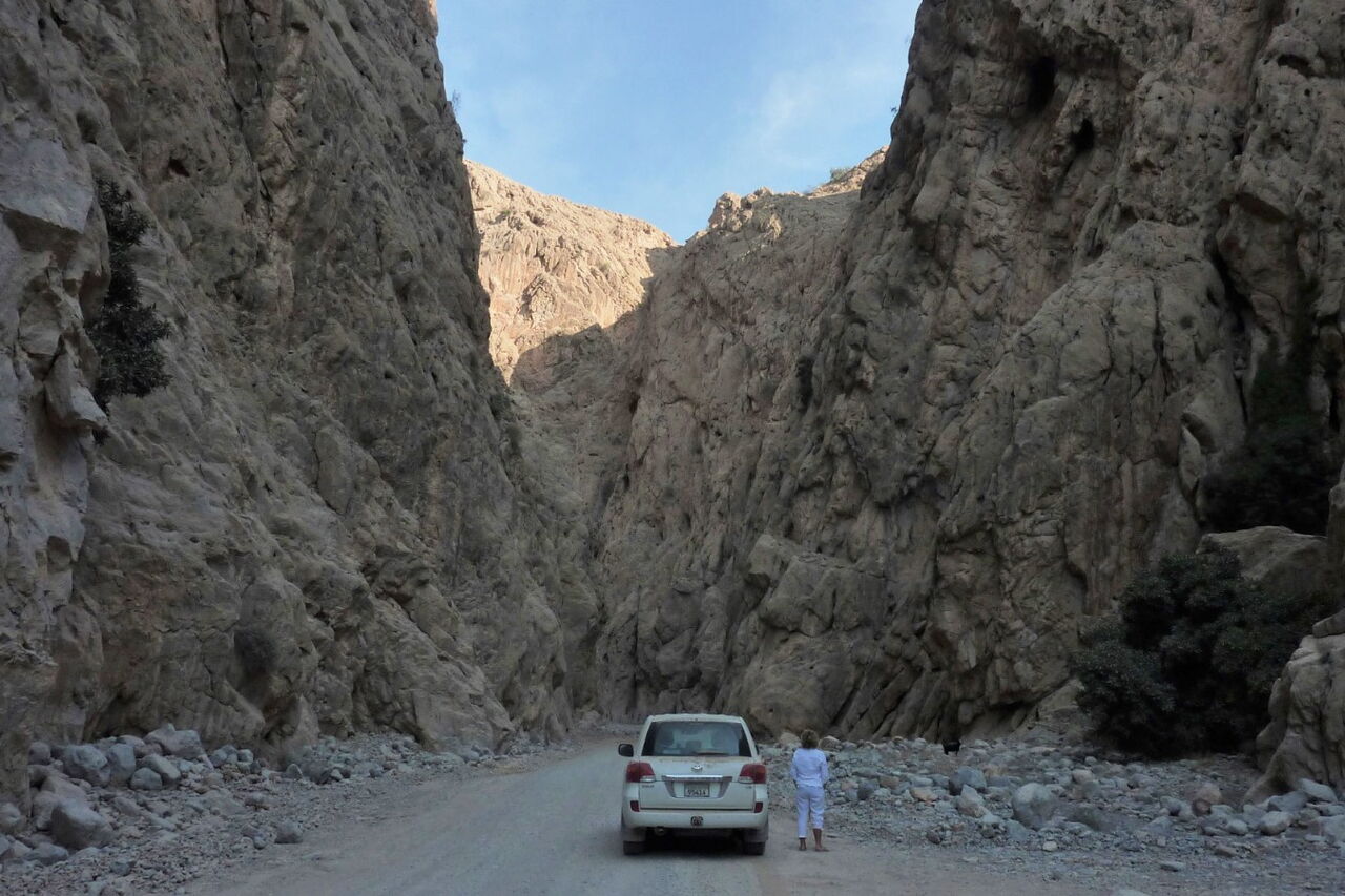 An der engsten Stelle ist das Trockenflussbett, welches in diesem Falle gleichzeitig die Straße ist, nur 5 bis 7 m breit, und die Felswände gehen 300 bis 400 m senkrecht in die Höhe.