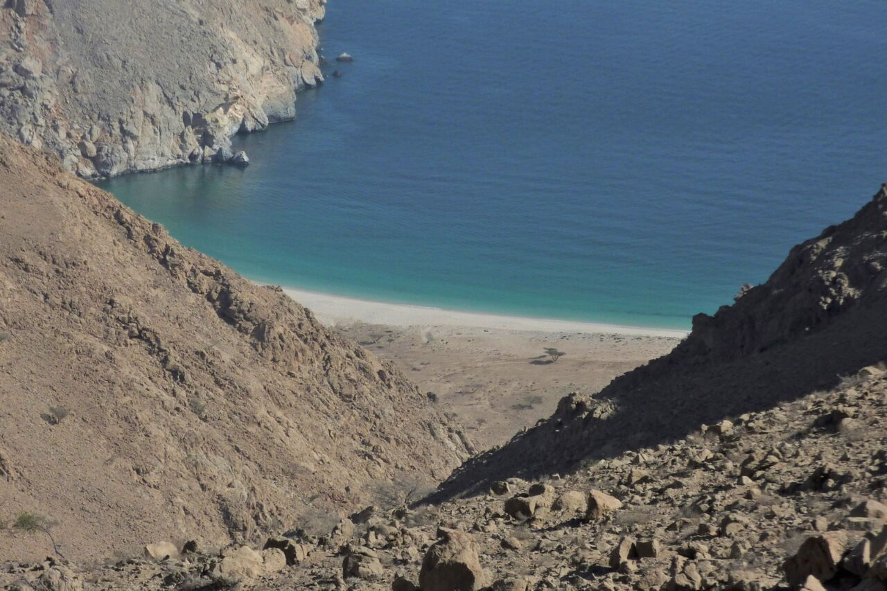 Wir gehen über den Grat und sehen schon aus der Ferne den Traumstrand. Nun haben wir noch eine schwierige Strecke durch ein Trockenflussbett vor uns.