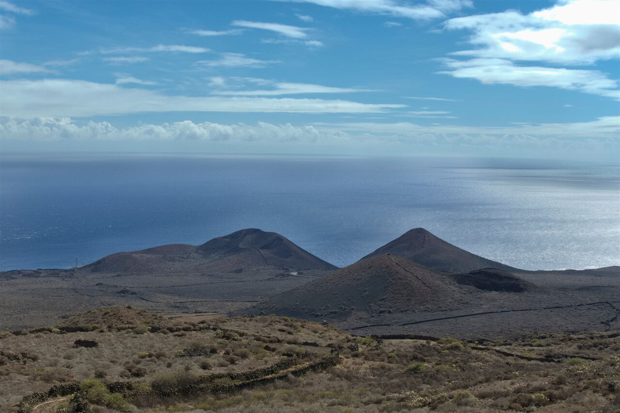 Nach 425 m queren und nach 60 m tangieren wir die Hauptstraße Richtung La Restinga. Nach weiteren 250 m setzen wir den Abstieg auf dem Camino (02) halb links (678 m) fort. Der gemütliche Abstieg führt durch ein Weinanbaugebiet, bis der Weg in eine Schotterpiste übergeht. Wir passieren den rechts von uns liegenden Vulkan, danach öffnet sich ein weiter Blick bis zur Hafenanlage von La Restinga.