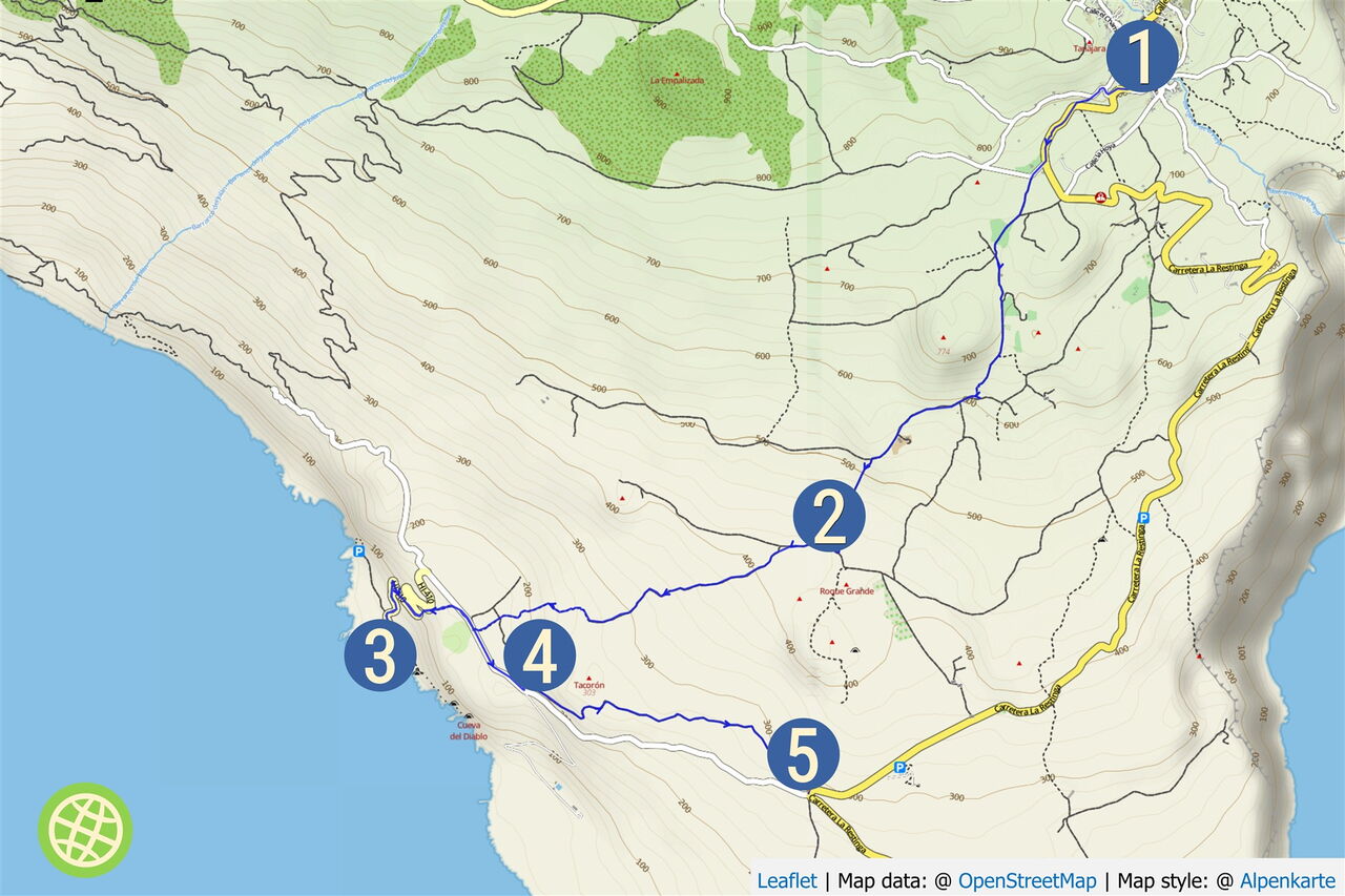 Von der (01) Bushaltestelle in Taibique (845 m) gehen wir auf der Verbindungsstraße Richtung La Restinga bergab und biegen direkt hinter dem Mirador links ab. Sobald wir die Dorfkirche sehen, biegen wir rechts in die Calle Atalaya ein. An einer gelben Mauer endet die Straße und wir gehen rechts. Kurz vor dem Friedhof biegen wir links in die Straße ab, sodass wir uns nun auf dem Camino La Restinga befinden.