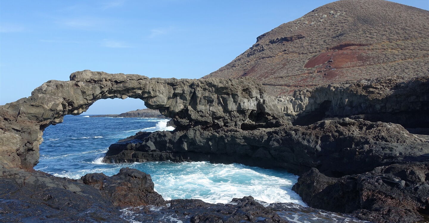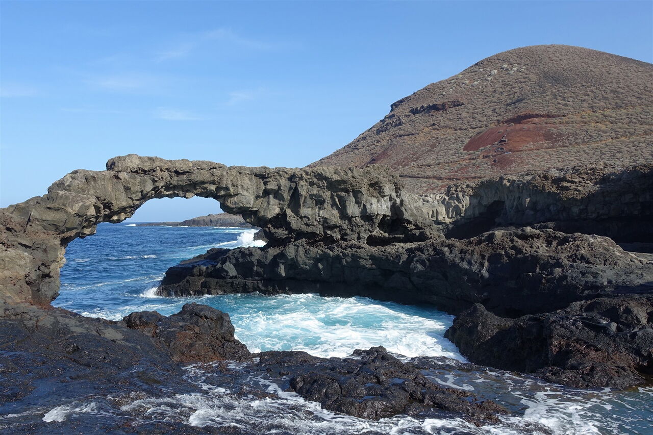 Vereinzelte Steinmännchen helfen bei der Orientierung im Gelände. Wir gehen nun direkt auf die Hälfte eines Vulkans zu, dessen andere Hälfte ins Meer abgerutscht ist. Nach einem langen Wegabschnitt bergab Richtung Meer kommt kurzfristig der Gedanke auf, man würde sich auf einem Irrweg befinden, aber nach einem Felsdurchbruch führt der Weg wieder links bergauf. In der Ferne kann man bereits einen Pfad unterhalb des halben Vulkans ausmachen. Ist dieser erreicht, so treffen wir auf eine Asphaltstraße. Diese gehen wir rechts herunter und folgen im weiteren Verlauf dem markierten Camino. Mehrmals queren wir die Anfahrtsstraße, bis wir dann links an dem Haus mit der Steinmauer vorbei weglos Richtung Meer gehen und auf den wunderschönen (03) Arco de Las Salinias (13 m) treffen. Bei Ebbe gibt es viele Höhlen zu erkunden.