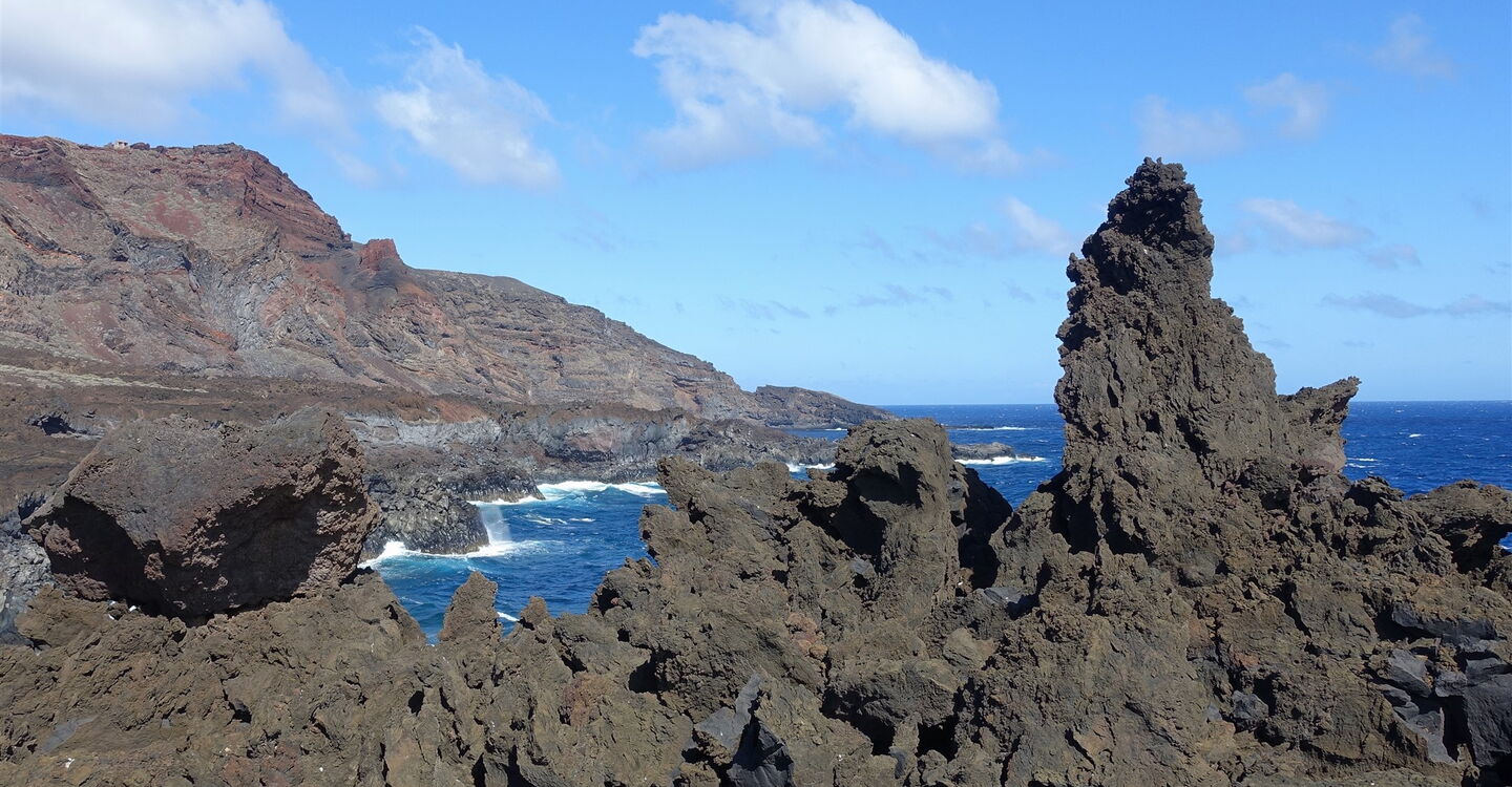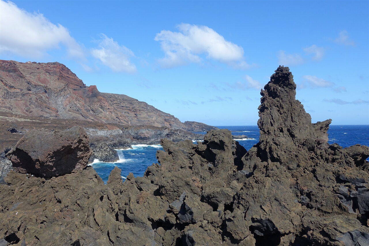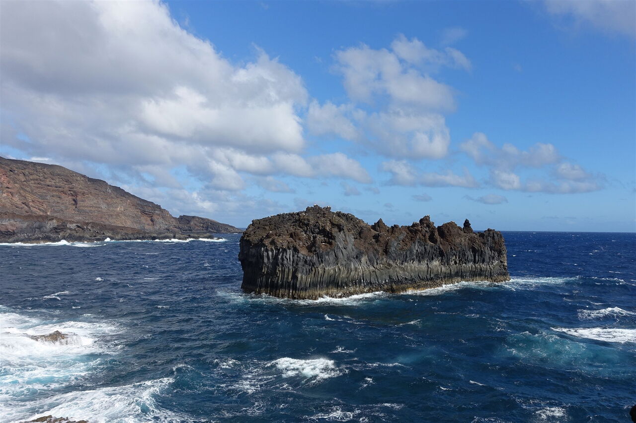 Der von Vulkangestein gesäumte Weg führt nun direkt in die sogenannte Malpais Grande – auf Deutsch: schlechtes Land. Aufgrund der Vulkanausbrüche ist das Land so zerklüftet, dass es nicht mehr zur landschaftlichen Nutzung oder zur Tierhaltung taugt. Abstecher rechts und links des Weges bedeuten erhebliche Verletzungsgefahr. Wir kommen vorbei an zwei Kreuzen und erreichen einen gemauerten Aussichtspunkt, den (03) Mirador Roque de Las Gaviotas (21 m). Wie entstehen Roques? Aus dem Munde eines Nicht-Vulkanologen klingt das wie folgt: Was wir vor uns sehen, ist das erstarrte Magma, das bei einem Vulkanausbruch nicht ausgeworfen wurde. Im Laufe der Jahrtausende hat die voranschreitende Erosion, in diesem Falle die tosenden Wellen des Meeres, das weichere Gestein abgetragen, es blieb der Roque.