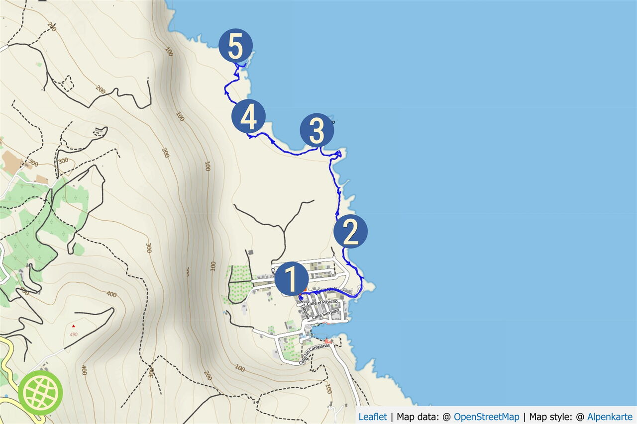 Vom (01) Start und Ziel in Tamaduste (22 m) gehen wir auf der Calle Malpais Richtung Meer. Vorbei kommen wir an dem stilistisch interessanten und gleichzeitig merkwürdigen Betonbau des Sportplatzes. Wir ignorieren den nachfolgenden linken Abzweiger und gehen durch eine Linkskehre der Straße zurück, bis sie endet. Ab hier beginnt der ausgezeichnete Pfad Richtung Playa Fortaleza.