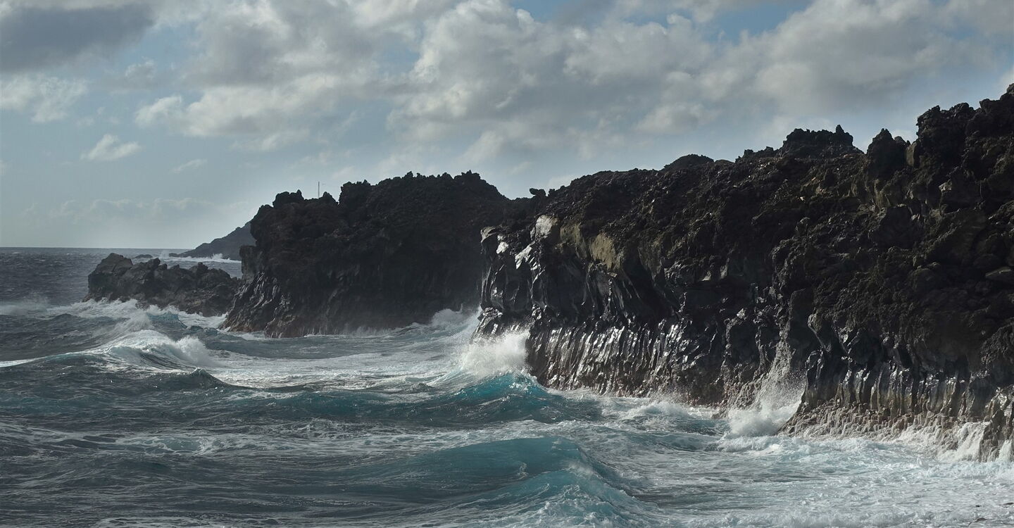 Immer wieder gleitet der (04) Blick entlang der Küste (29 m), dabei sollte man nicht die Konzentration auf den Weg verlieren, denn wir gehen auf sogenannter Aa-Lava, auch Brockenlava genannt. Beim Abkühlen bildete sich eine dicke Kruste, die bei weiterer Bewegung in raue und messerscharfe Teilchen zerbrochen ist.
