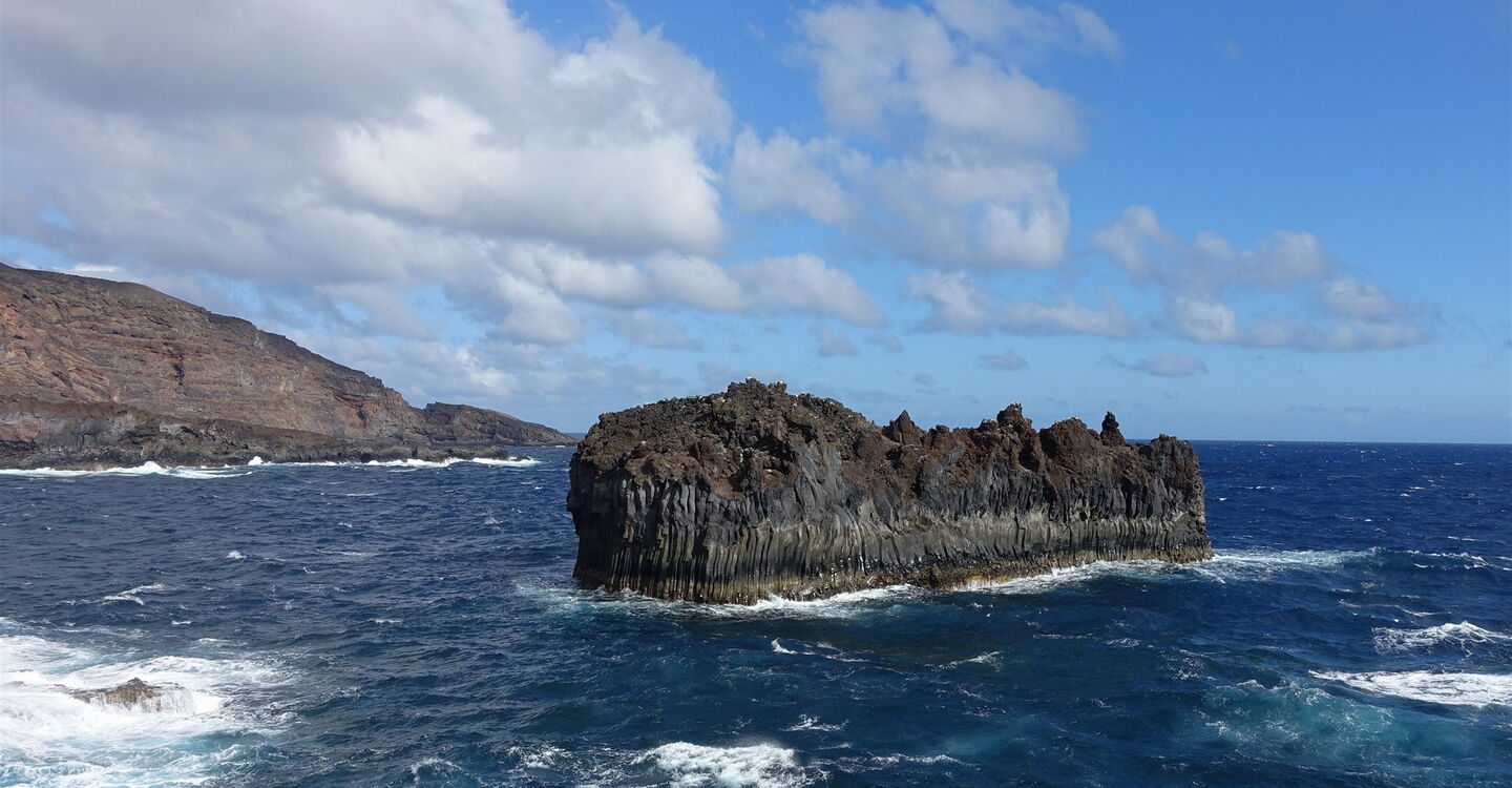 Wir erreichen das erste beeindruckende Naturschauspiel. Aus den Fluten erheben sich Magmasäulen, die an Pfeifen einer gigantischen Orgel erinnern. Basaltsteine können nur in dieser Form entstehen, wenn Magma an der Luft erstarrt. Entlang der (02) Küste (13 m) mit ihrer extrem salzhaltigen Luft und den nährstoffarmen Böden wächst die seidenhaarige Schizogyne. Ihre kräftige gelbe Blüte steht im krassen Kontrast zum schwarzen Untergrund.